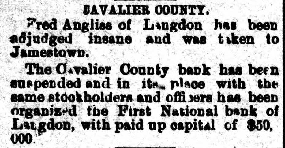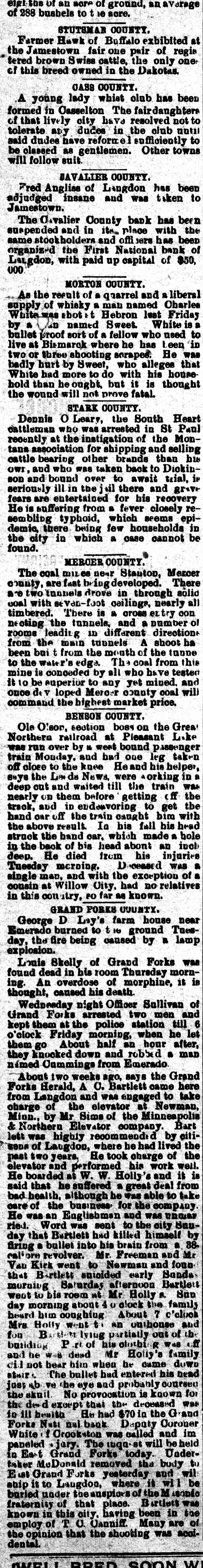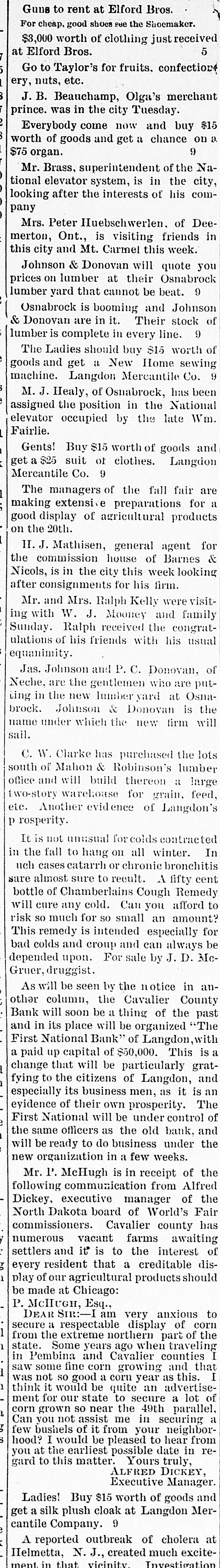 ery, nuts, etc. J. B. Beauchamp, Olga's merchan prince. was in the city Tuesday. Everybody come now and buy $1 worth of goods and get a chance on : 9 $75 organ. Mr. Brass, superintendent of the Na tional elevator system, is in the city looking after the interests of his com pany Mrs. Peter Huebschwerlen. of Dee merton, Ont., is visiting friends in this city and Mt. Carmel this week. Johnson & Donovan will quote you prices on lumber at their Osnabrocl lumber yard that cannot be beat. 9 Osnabrock is booming and Johnson & Donovan are in it. Their stock o lumber is complete in every line. 9 The Ladies should buy $15 worth o goods and get a New Home sewing machine. Langdon Mercantile Co. M. J. Healy, of Osnabrock, has beer assigned the position in the Nationa elevator occupied by the late Wm Fairlie. Gents! Buy $15 worth of goods and get a $25 suit of clothes. Langdor Mercantile Co. 9 The managers of the fall fair ar making extensive preparations for good display of agricultural product on the 20th. H. J. Mathisen, general agent fo the commission house of Barnes & Nicols, is in the city this week lookins after consignments for his firm. Mr. and Mrs. Ralph Kelly were visit ing with W. J. Mooney and famil; Sunday. Ralph received the congrat ulations of his friends with his usua equanimity. Jas. Johnson and P. C. Donovan, o Neche, are the gentlemen who are put ting in the new lumber yard at Osna brock. Johnson & Donovan is the name under which the new firm wil sail. C. W. Clarke has purchased the lot south of Mahon & Robinson's lumbe office and will build thereon a larg two-story warehouse for grain, feed etc. Another evidence of Langdon P rosperity. It is not unusual colds contracte in the fall to hang on all winter. I: uch cases catarrh or chronic bronchiti sare almost sure to recult. A fifty cen bottle of Chamberlains Cough Remed will cure any cold. Can you afford t risk SO much for SO small an amount This remedy is intended especially fo bad colds and croup and can always b depended upon. For sale by J. D. Mo Gruer, druggist. As will be seen by the notice in an other column, the Cavalier Count Bank will soon be a thing of the pas and in its place will be organized "Th First National Bank" of Langdon, wit a paid up capital of $50,000. This is change that will be particularly grat fying to the citizens of Langdon, an especially its business men, as it is a eyidence of their own prosperity. Th First National will be under control o the same officers as the old bank, an will be ready to do business under th new organization in a few weeks. Mr. l'. McHugh is in receipt of th following communication from Alfre Dickey, executive manager of th North Dakota board of World's Fai commissioners. Cavalier county ha numerous vacant farms awaitin settlers and it' is to the interest o every resident that a creditable dis play of our agricultural products should be made at Chicago: P. McHuGH, Esq., DEAR SIR:-I am very anxious t secure a respectable display of cori from the extreme northern part of th state. Some years ago when traveling in Pembina and Cavalier counties