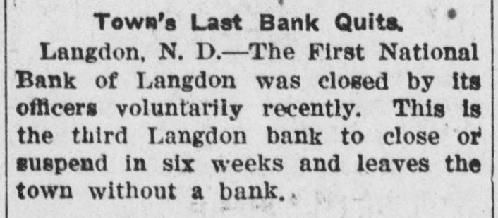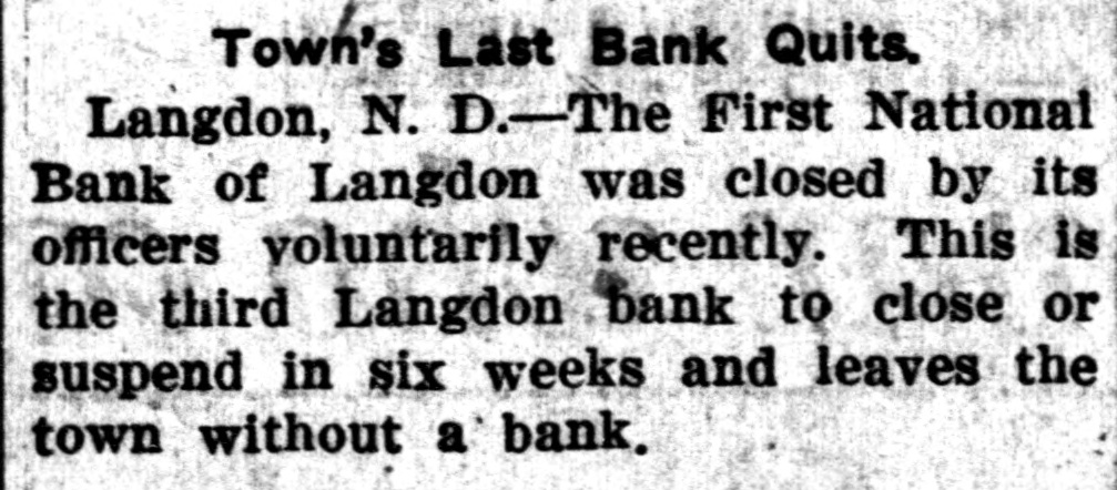 Town's Last Bank Quits. Langdon, N. D.-The First National Bank of Langdon was closed by its officers voluntarily recently. This is the third Langdon bank to close or suspend in six weeks and leaves the town without a bank. 1