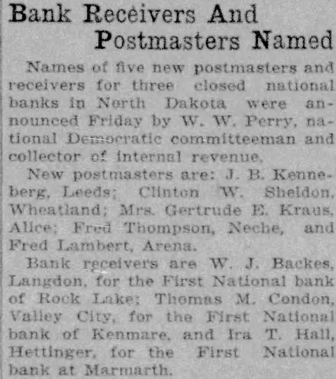 Bank Receivers And Postmasters Named Names of five for three closed national banks in North Dakota were nounced Friday by Perry, tional committeeman and New postmasters Kenneberg, Leeds: Clinton W Sheldon Alice: Fred Thompson, Neche, Arena. Bank are W Backes, Langdon, for the First bank Rock Thomas M. Condon, Valley for National bank of Ira Hall, for the First National bank at