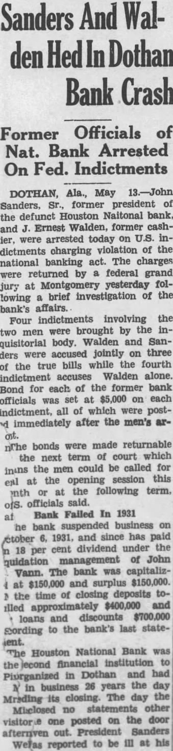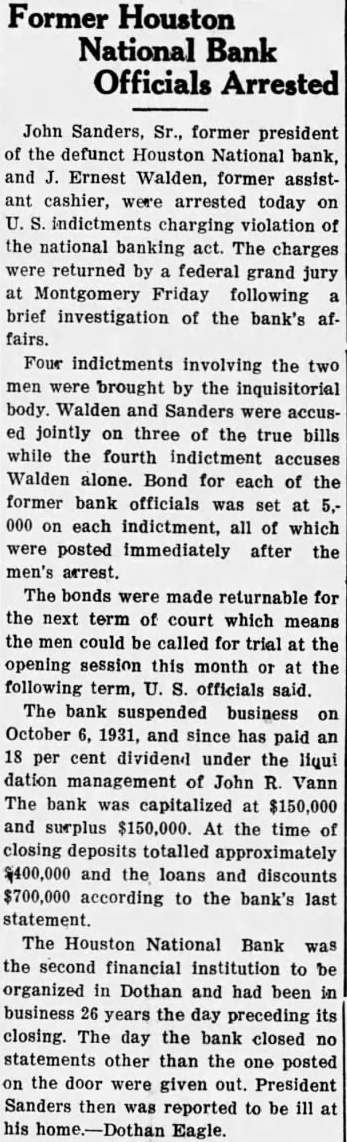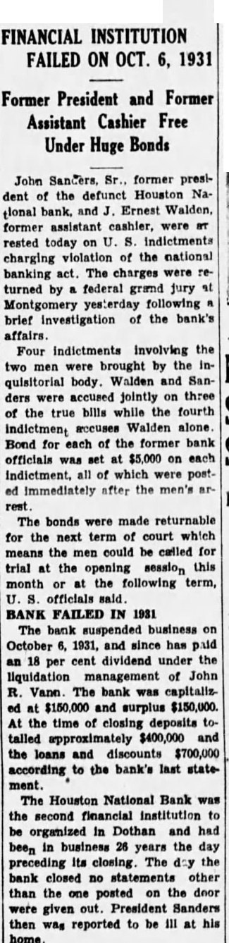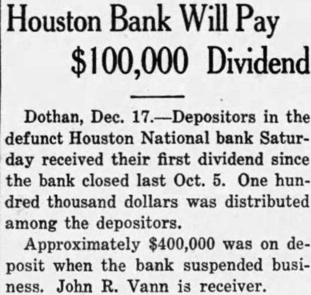 INFORMATION YET ON DEPOSITS CLOSED BANK Bank Examiner Dolan and Three Assistants In Charge of Bank's Affairs Reed Dolan, national bank aminer, who arrived in Dothan this morning from Montgomery, with three assistants take over the fairs of the Houston National bank, which did not open for business yesterday, said today he had not tim eyet to Inspect the books of the financial Institution closely enough to tell how much money deposit when the bank closed Officials of the closed bank said yesterday that the bank had approximately $400,000 on deposit despite heavy withdrawals few before the closing. More than $700.on deposit In the bank cording previous statement will be some time before the books of the bank can be checked and the exact financial condition of the institution known, Examiner Dolan said today. Officials of the bank said yesterday that the loans and discounts totalled approximately $700,000. The bank's capital stock and surplus $300,000 Assistant bank examiners who assisting Mr. Dolan are Miller, Snead and Johnson Mr. Dolan said today he couldn't tell how long would be required for the four to complete the work the bank. A sign placed on the doors of the bank today In addition to the notice of the closing yesterday "This bank suspended business after the close October in charge of Reed Dolan, national bank examiner, under the direction of the comptroller of the currency. Payments of any maturing obligations will be accepted daily between the hours of and Directors of the Houston Na tional bank, which, was organized 26 years ago, being the second bank in Dothan. voted to close the bank at meeting Monday night. Depositors of the bank were ported to have numbered approximately 1,500. majority of the positors are reported to be Dothan residents. Among the depositors was the City of Dothan, which had approxImately $40,000 on deposit in the bank. Most of the city's deposit consists secured funds, and city officials said today that they didn't believe the city would lose penny result of the closing of the bank. The funds, however, will be tied for time and will dicap the operation of the city temporarily, the officials explained. Between $8,000 and $10,000 of the funds of county school districts also was on deposit In the bank. but the general funds of the counschools are in another bank. county school officials said today.