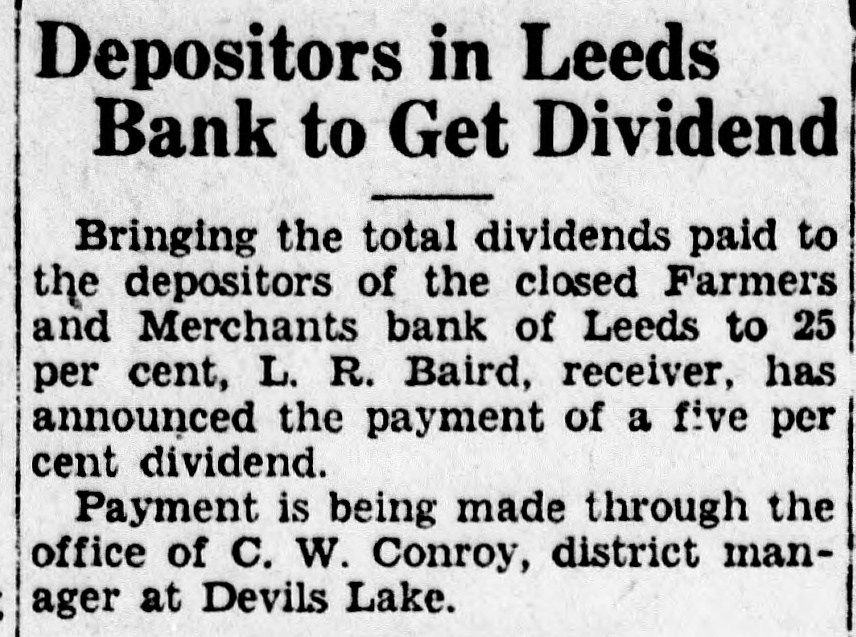 Depositors in Leeds Bank to Get Dividend Bringing the total dividends paid to the depositors of the closed Farmers and Merchants bank of Leeds to 25 per cent, L. R. Baird, receiver, has announced the payment of a five per cent dividend. Payment is being made through the office of C. W. Conroy, district manager at Devils Lake.