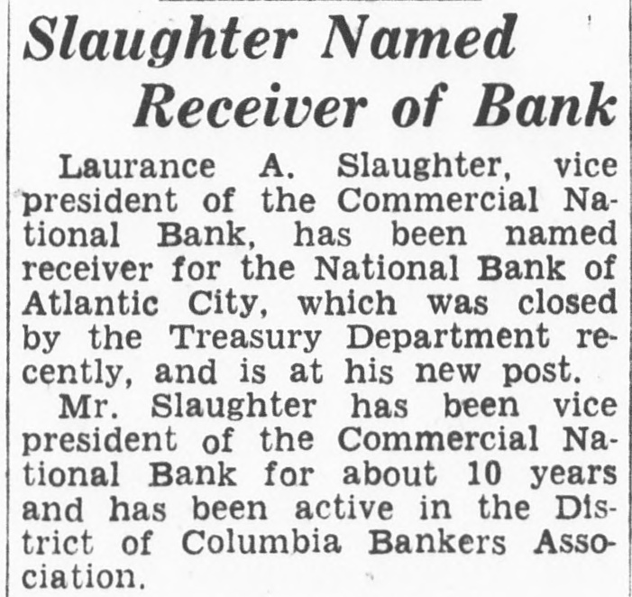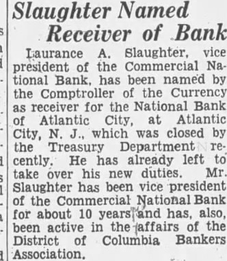 Slaughter Named Receiver of Bank Laurance A. Slaughter, vice president of the Commercial National Bank, has been named receiver for the National Bank of Atlantic City, which was closed by the Treasury Department recently, and is at his new post. Mr. Slaughter has been vice president of the Commercial National Bank for about 10 years and has been active in the District of Columbia Bankers Association.