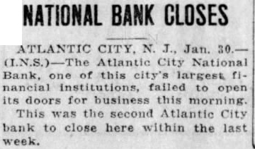 NATIONAL BANK CLOSES ATLANTIC CITY. N. Jan. Atlantic City Bank, largest institutions, failed open its doors for business this This the second Atlantic bank to close here within the week.