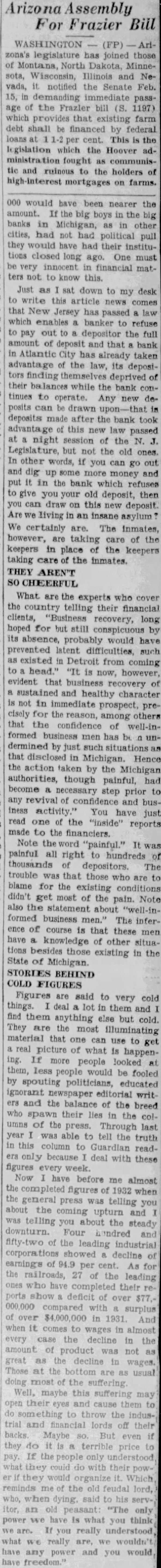 zona's legislature has joined North Dakota, Minnesota, Wisconsin, Illinois Nevada, notified Senate 15, passage of the Frazler bill (S. 1197) which that farm shall be financed by federal This the legislation which the Hoover ministration fought communistic ruinous to the holders on farms. 000 would have been nearer the amount. boys the big banks in Michigan, other cities, not political would have had their institutions closed long ago. One be very innocent financial ters not know Just as down to desk my write this article news that New Jersey has passed which enables banker refuse pay out depositor the amount of deposit and that bank Atlantic City has already taken advantage the law, its deposifinding themselves deprived their balances while the bank tinues to operate. Any new posits drawn deposits after the bank took advantage this new passed night session of the Legislature, but the old ones. In other words, if you can go out and dig up some money and it the bank which refuses give you your old deposit, then draw on this new deposit. living an insane asylum We certainly are. The Inmates, however, taking of the keepers in place of the keepers taking the inmates. THEY What are the experts who cover the country telling their financial clients, "Business recovery, long hoped for but still by its absence, probably would have prevented latent difficulties, such existed in Detroit from coming is now, however, evident that recovery of sustained and healthy character not in immediate prospect, precisely for among others that the confidence of formed has be that disclosed in Michigan. Hence the action taken by Michigan authorities, though painful, had become prior to any revival confidence activity." You have just read "inside" reports made to the financiers. Note "painful." It painful all right hundreds of thousarids depositors. The trouble that those who are to blame for the existing conditions get most of the Note pain. also statement about formed business men.' The inferof course is that these men knowledge other situathose existing in the State of Michigan. STORIES BEHIND COLD FIGURES Figures are said to very cold things. lot them and find them else but cold. They the most illuminating material one use to get picture of what is happening. more people looked less would be fooled by spouting politicians, educated writ and the balance the breed spawn their in the columns the press. Through last year was to tell the truth this column Guardian readbecause deal with these figures week Now have before me almost the completed figures 1932 when the general press was telling about the coming upturn and telling about the steady downturn. Four hundred of the leading industrial showed decline earnings per railroads, the leading have completed their deficit of over in comes to wages almost every decline amount product great decline Those the are doing maybe their them trial financial lords backs they do terrible people organize reminds old feudal when to his an only power have is what you think really understood, really any power