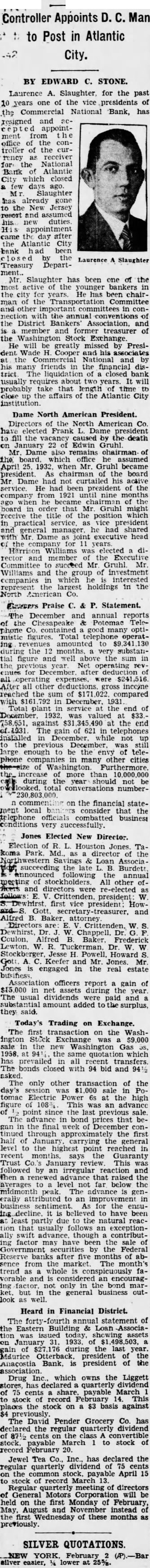 Controller Appoints D. C. Man to Post in Atlantic City. BY EDWARD C. STONE. Laurence A. Slaughter, for the past 10 years one of the vice presidents of the Commercial National Bank, has resigned and repted appointment from the office the controller of the rency receiver National City which closed few days Mr. Slaughter has already the New Jersey resort and assumed new duties His appointment came day after the Atlantic City bank had been closed by the Laurence Slaughter Treasury DepartMr. Slaughter has been one of the most the younger bankers the city for years. He has been chair man the Transportation Committee and other important committees in conwith the the District Association. and is member and treasurer of the Washington Stock Exchange He will greatly missed by President Wade Cooper the Commerc and his many friends the financial district The liquidation of closed bank usually requires about two years. It will probably take that of time close the affairs of the Atlantic City institution Dame North American President Directors the North American Co. Frank to fill the by the death on January 22 Edwin Gruhl Mr. Dame also remains chairman of the board. which he assumed April 25. 1932, when Mr. Gruhl became president. As of the board Mr Dame had not curtailed his active service. He been president of the company from 1921 nine months ago he of the board that Mr. Gruhl might receive the title of the position which in practical service as vice president and general manager. he had shared with Mr Dame as executive head for Williams was elected director and member the Executive Committee succeed Mr Gruhl Mr Williams and the of investment companies which interested represent the largest holdings in the North American Co. Praise C. & P. Statement. The December and annual reports of the Chesapeake & Potomac Telephone Co. contained good optimistic figures. Total telephone operating revenues amounted to $9 during the 12 months. very substantial figure and well the sum in the Net operating rev for December deduction of all operating expenses, were $241,516 After all other deductions gross income reached the sum of $171 compared with in December. 1931 Total plant in service the end of December 1932, was valued at $33. 758.651. against $31 at the end of-1931 The gain of 621 in installed in while to the December. was large enough to be the envy of telephone companies in many other cities the increase more than 10,000,000 during the year should not be overlooked. total conversations numbern comment on the financial statement local consider the telephone combatted business very accessfully. Jones Elected New Director. Election of R. L. Houston Jones. Ta koma Park Md., of the Northwestern & succeeding the late B. Burdett is announced following the annual meeting of stockholders. All other ofand directors re-elected S.Dewhirst. first vice president: How Alfred B. Baker attorney Dewhirst, W Chappell. Dr. Coulon. Alfred B. Baker. Frederick Lewton. W. R. Tuckerman. Dr. W. W Stockberger. Jesse H. Powell, Howard Gott. A. Keefer and Mr Jones. Mr. Jones is engaged in the real estate busifiess. Association officers report gain of $15,000 in net assets during the year The usual dividends were paid and substantial amount added to surplus, they said. Today's Trading on Exchange. The transaction on the Washington Stock Exchange $9,000 sale in the new Washington Gas 1958. at the same quotation which has prevailed all transfers. The bonds closed with 94 bid and 9416 The only other transaction of the day's 000 sale in tomac Electric 6s at the high figure of 108 This was an advance of point since the last previous sale. The advance in bond prices that began in the final week of continued through the first half of January carrying the level to the highest point reached in recent says the Guaranty Trust Co. January This was followed by an irregular reaction and then advance that raised the averages to level not far below the midmonth peak The advance is generally attributed to an improvement in business sentiment. for the ensuing it to have been least partly due the natural reaction that usually follows an exceptionally swift advance. though a contributing factor may have been the sale Government by the Federal Reserve after five months of absence from the The month's trend as whole is conspicuously favorable and is considered an encouraging not the bond market. but the general business outlook as well. Heard in Financial District. The forty fourth statement of the Building & Loan Association was ssued today showing assets gain of 176 during the last year. Anacostia Bank. is president of the Drug which owns the Liggett has declared quarterly dividend of 75 cents share, payable March record This the on a $3 basis against $4 previously. The David Pender Grocery Co. has declared the regular quarterly dividend of 87ยฝ cents stock. payable March to stock of record February 20. Jewel Tea Co. has declared the 'regular quarterly dividend of 75 cents on the common stock, payable April 15 to stock of record 13. Regular quarterly meeting directors of General Motors Corporation will be held on the first Monday of February, May August November instead of the first Wednesday of these months as previously. SILVER QUOTATIONS NEW YORK February silver lower at 25%.