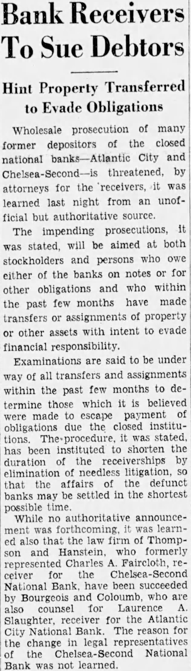 Hint Transferred Property to Evade Obligations Wholesale prosecution of many depositors of the closed former City and national by attorneys for the receivers, last night from an unoflearned ficial authoritative source. The impending prosecutions, will be aimed at both stated, stockholders who owe persons the banks on notes for either and who within other obligations few months made the past transfers assignments of property assets with intent to evade other financial responsibility. Examinations are said to be under way of all assignments the few months to dewithin past those which believed termine made escape payment the closed instituobligations tions. been instituted shorten the has duration the receiverships by elimination of needless that affairs defunct banks settled in the shortest may possible time. While no authoritative announcement learnthat law firm of ThompHanstein, formerly Charles ceiver the National Bank. have been succeeded Bourgeois and Coloumb, who counsel Laurence receiver for the Atlantic National Bank The reason for City the change legal National Bank was not learned.