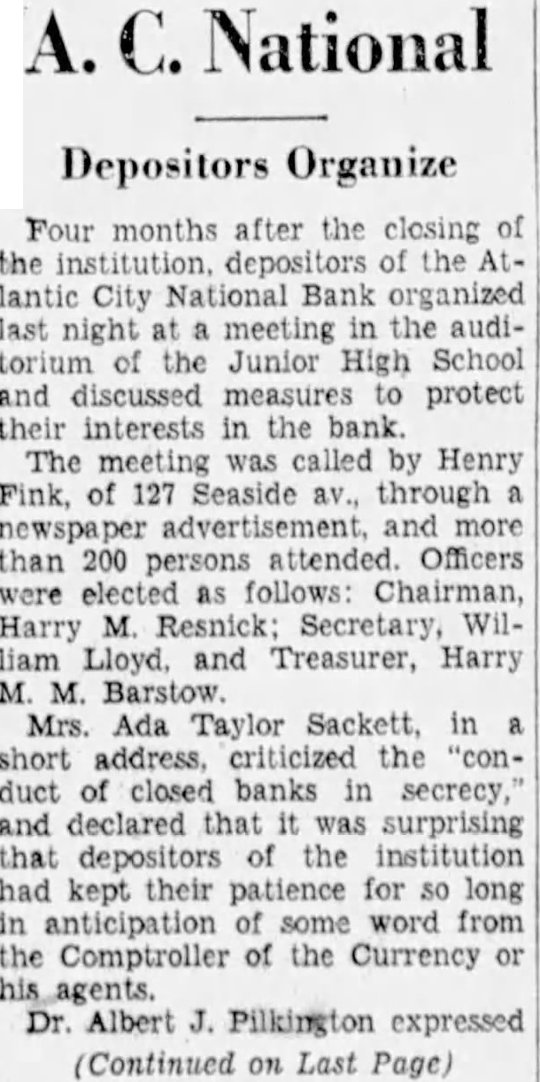 National Depositors Organize Four months after the closing the of lantic City Bank organized the auditorium the Junior High School and discussed protect interests the was called by Henry Fink, of 127 Seaside through and than 200 attended Officers follows: Harry and Treasurer, Harry Mrs. Sackett, short the banks secrecy, and declared that was surprising depositors the institution had kept their patience for anticipation word Comptroller of the Currency Albert Pilkington expressed (Continued on Last Page)