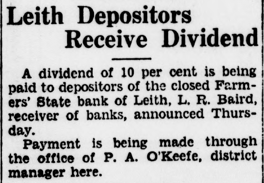 Leith Depositors Receive Dividend A dividend of 10 per cent is being paid to depositors of the closed Farmers' State bank of Leith, L. R. Baird, receiver of banks, announced Thursday. Payment is being made through the office of P. A. O'Keefe, district manager here.