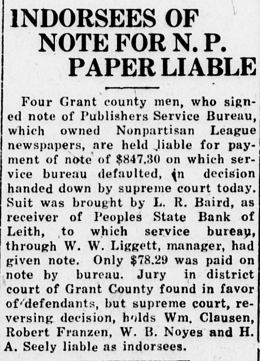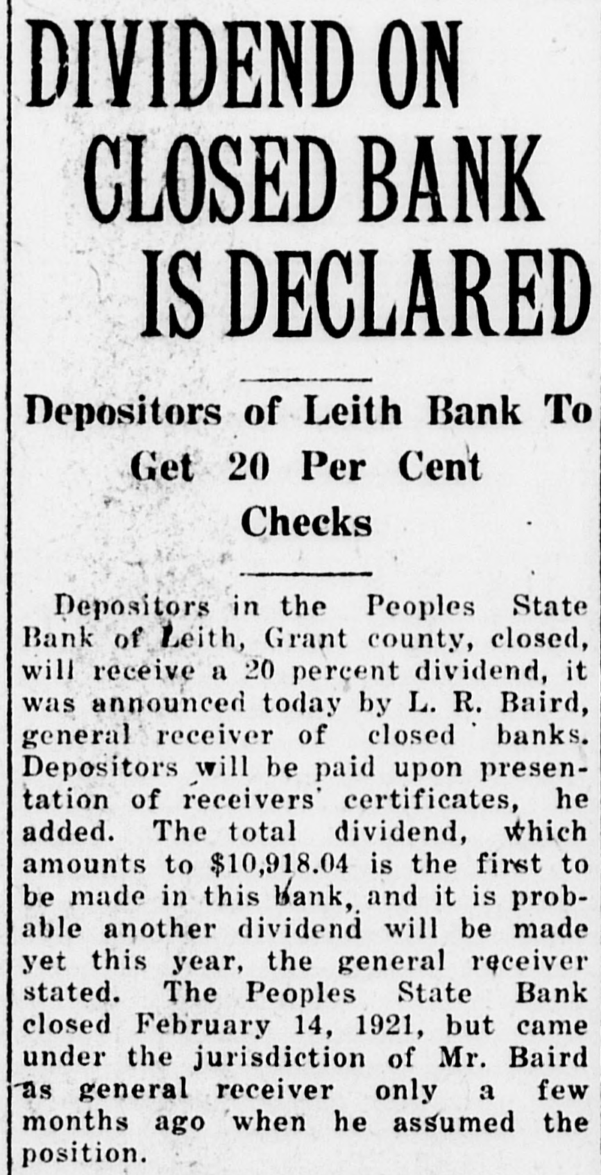 DIVIDEND ON CLOSED BANK IS DECLARED Depositors of Leith Bank To Get 20 Per Cent Checks Depositors in the Peoples State Bank of Leith, Grant county, closed, will receive a 20 percent dividend, it was announced today by L. R. Baird, general receiver of closed banks. Depositors will be paid upon presentation of receivers certificates, he added. The total dividend, which amounts to $10,918.04 is the first to be made in this bank, and it is probable another dividend will be made yet this year, the general receiver stated. The Peoples State Bank closed February 14, 1921, but came under the jurisdiction of Mr. Baird as general receiver only a few months ago when he assumed the position.