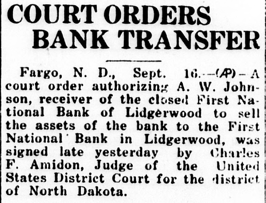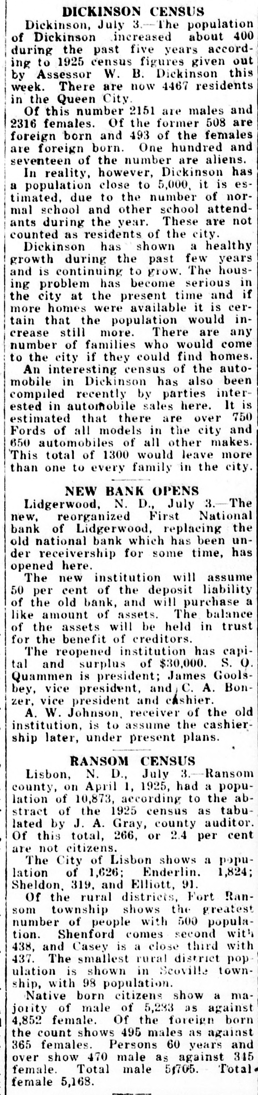 DICKINSON CENSUS Dickinson, July 3.-The population of Dickinson increased about 400 during the past five years according to 1925 census figures given out by Assessor W. B. Dickinson this week. There are now 4467 residents in the Queen City. Of this number 2151 are males and 2316 females. Of the former 508 are foreign born and 493 of the females are foreign born. One hundred and seventeen of the number are aliens. In reality, however, Dickinson has a population close to 5,000, it is estimated, due to the number of normal school and other school attendants during the year. These are not counted as residents of the city. Dickinson has shown a healthy growth during the past few years and is continuing to grow. The housing problem has become serious in the city at the present time and if more homes were available it is certain that the population would increase still more. There are any number of families who would come to the city if they could find homes. An interesting census of the automobile in Dickinson has also been compiled recently by parties interested in automobile sales here. It is estimated that there are over 750 Fords of all models in the city and 650 automobiles of all other makes. This total of 1300 would leave more than one to every family in the city. NEW BANK OPENS Lidgerwood, N. D., July 3.-The new, reorganized First National bank of Lidgerwood, replacing the old national bank which has been under receivership for some time, has opened here. The new institution will assume 50 per cent of the deposit liability of the old bank, and will purchase a like amount of assets. The balance of the assets will be held in trust for the benefit of creditors. The reopened institution has capital and surplus of $30,000. S. O. Quammen is president; James Goolsbey, vice president, and C. A. Bonzer, vice president and cashier. A. W. Johnson, receiver of the old institution, is to assume the cashiership later, under present plans. RANSOM CENSUS Lisbon, N. D., July 3.-Ransom county, on April 1, 1925, had a population of 10,873, according to the abstract of the 1925 census as tabulated by J. A. Gray, county auditor. Of this total, 266, or 2.4 per cent are not citizens. The City of Lisbon shows a population of 1,626; Enderlin. 1,824; Sheldon, 319, and Elliott, 91. Of the rural districts, Fort Ransom township shows the greatest number of people with 500 population. Shenford comes second with 438, and Casey is a close third with 437. The smallest rural district population is shown in Scoville township, with 98 population. Native born citizens show a majority of male of 5,283 as against 4,852 female. Of the foreign born the count shows 495 males as against 365 females. Persons 60 years and over show 470 male as against 345 female. Total male 5,705. Total female 5,168.