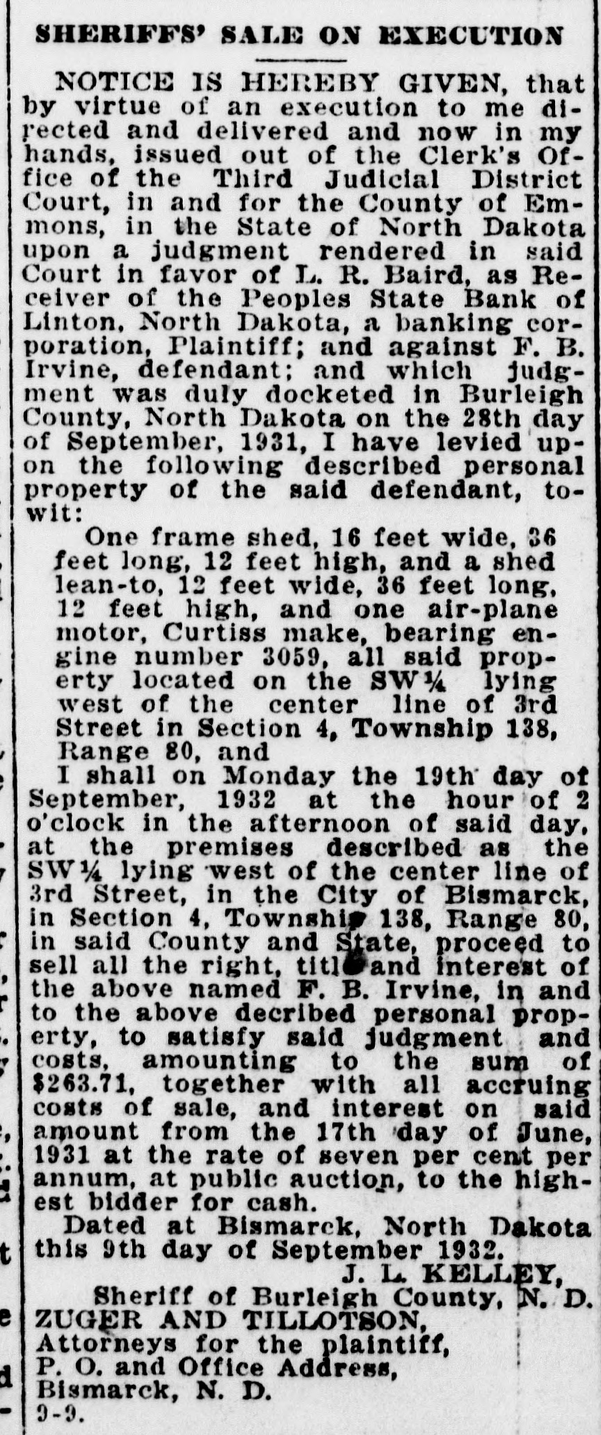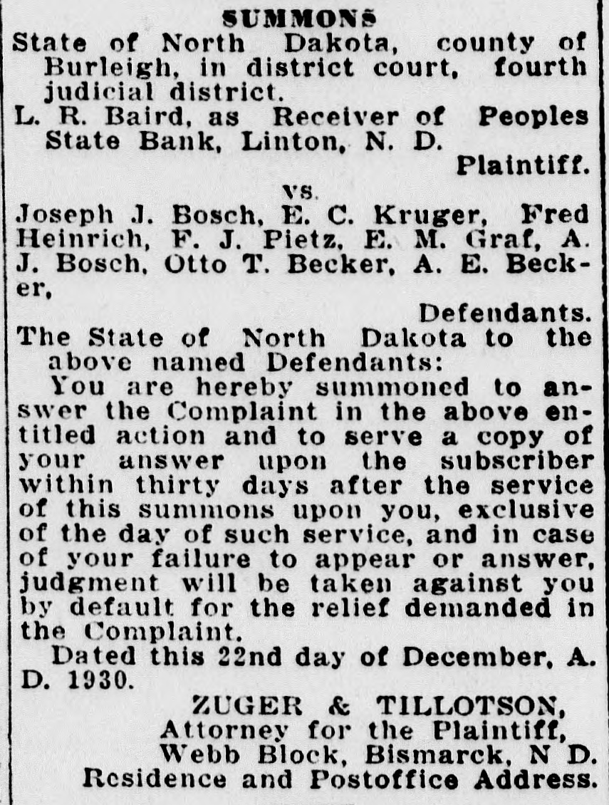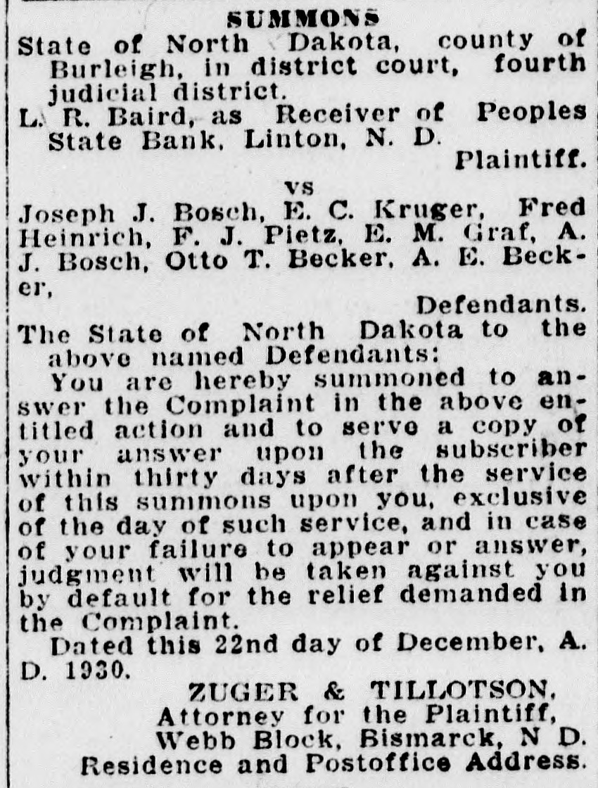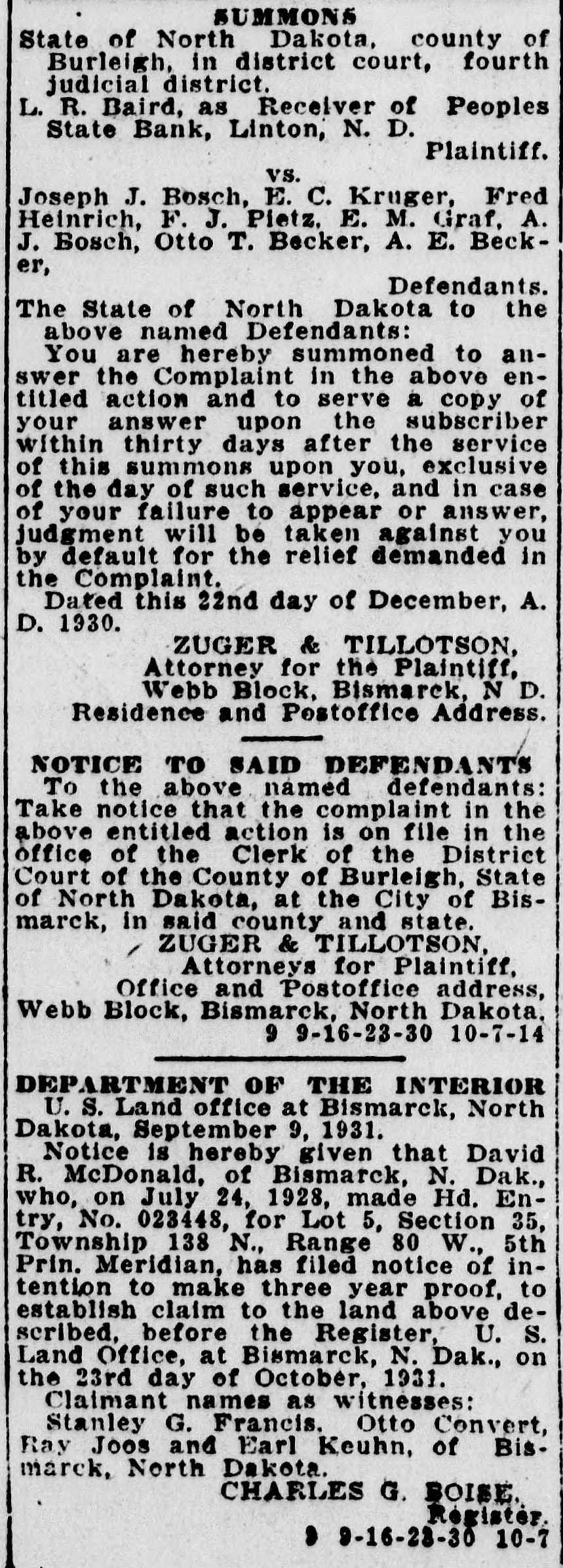 SUMMONS State of North Dakota, county of Burleigh, in district court, fourth judicial district. L. R. Baird, as Receiver of Peoples State Bank, Linton, N. D. Plaintiff. vs. Joseph J. Bosch, E. C. Kruger, Fred Heinrich, F. J. Pietz. E. M. Graf, A. J. Bosch, Otto T. Becker, A. E. Becker, Defendants. The State of North Dakota to the above named Defendants: You are hereby summoned to allswer the Complaint in the above entitled action and to serve a copy of your answer upon the subscriber within thirty days after the service of this summons upon you, exclusive of the day of such service, and in case of your failure to appear or answer, judgment will be taken against you by default for the relief demanded in the Complaint. Dated this 22nd day of December, A. D. 1930. ZUGER & TILLOTSON, Attorney for the Plaintiff, Webb Block, Bismarck, N D. Residence and Postoffice Address. NOTICE TO SAID DEFENDANTS To the above named defendants: Take notice that the complaint in the above entitled action is on file in the office of the Clerk of the District Court of the County of Burleigh, State of North Dakota, at the City of Bismarck, in said county and state. ZUGER & TILLOTSON, Attorneys for Plaintiff, Office and Postoffice address, Webb Block, Bismarck, North Dakota. 9 9-16-23-30 10-7-14 DEPARTMENT OF THE INTERIOR U. S. Land office at Bismarck, North Dakota, September 9, 1931. Notice is hereby given that David R. McDonald, of Bismarck, N. Dak., who, on July 24, 1928, made Hd. Entry, No. 023448, for Lot 5, Section 35, Township 138 N., Range 80 W., 5th Prin. Meridian, has filed notice of intention to make three year proof, to establish claim to the land above described, before the Register, U. S. Land Office, at Bismarck, N. Dak., on the 23rd day of October, 1931. Claimant names as witnesses: Stanley G. Francis. Otto Convert, Ray Joos and Earl Keuhn, of Bismarck, North Dakota. CHARLES G. BOISE. Register. , 9-16-23-30 10-7