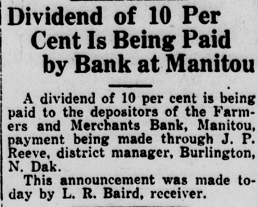 Dividend of 10 Per Cent Is Being Paid by Bank at Manitou A dividend of 10 per cent is being paid to the depositors of the Farmers and Merchants Bank, Manitou, payment being made through J. P. Reeve, district manager, Burlington, N. Dak. This announcement was made today by L. R. Baird, receiver.