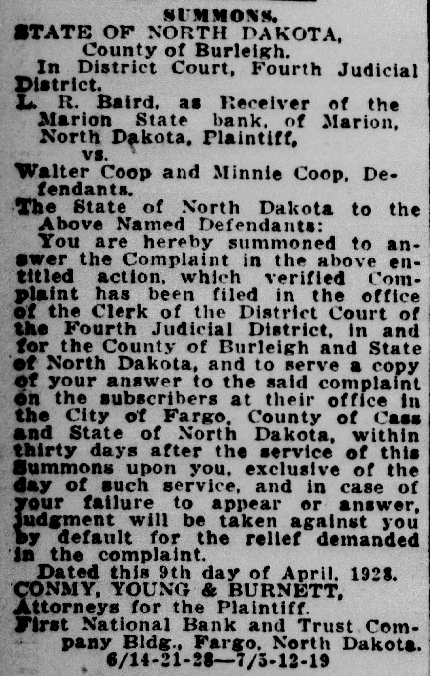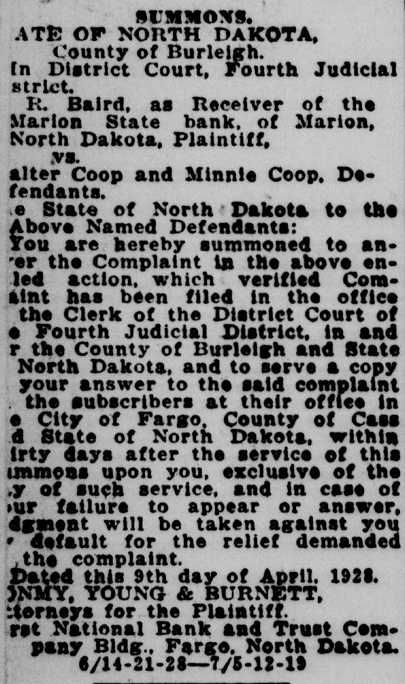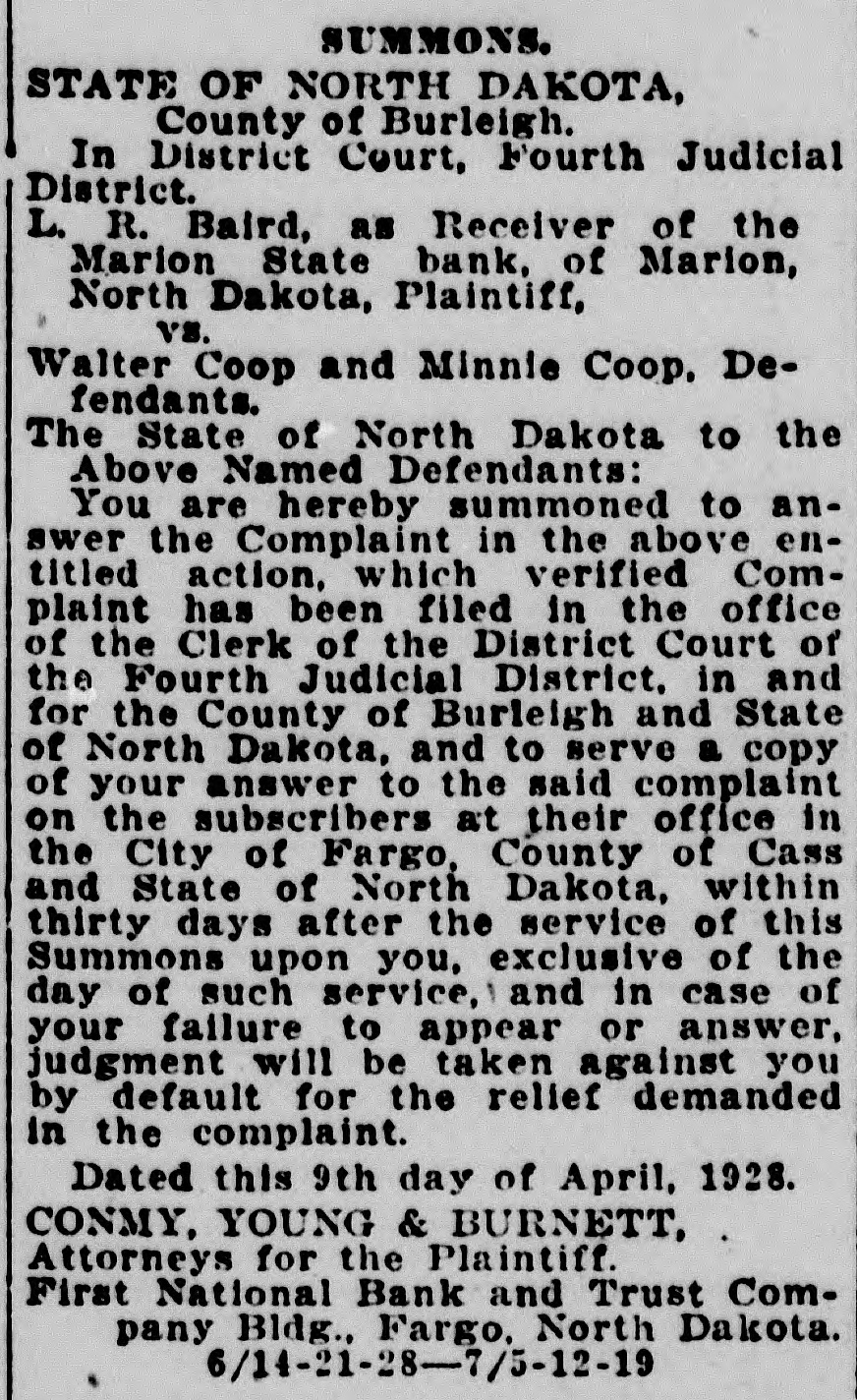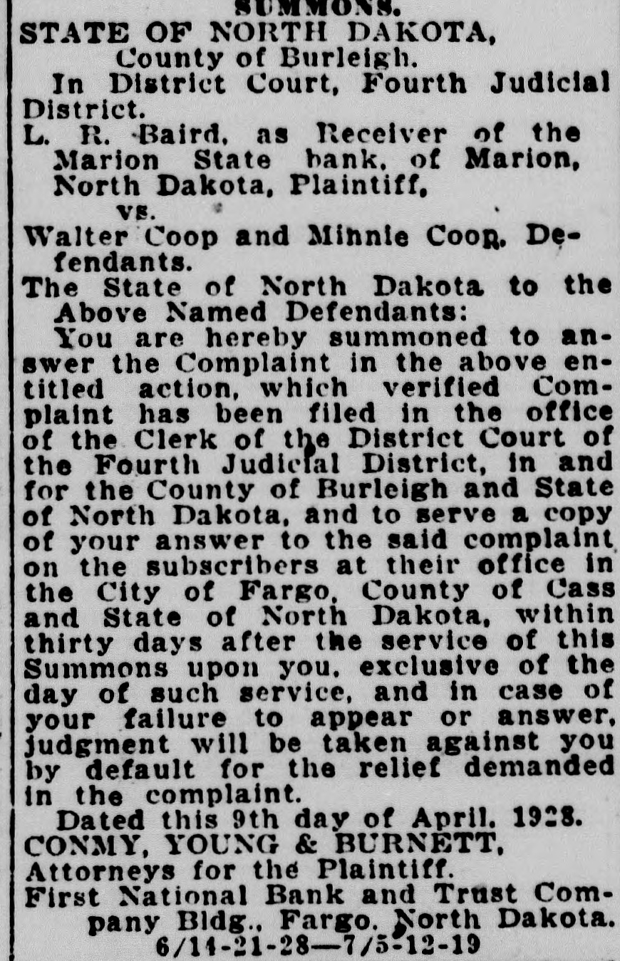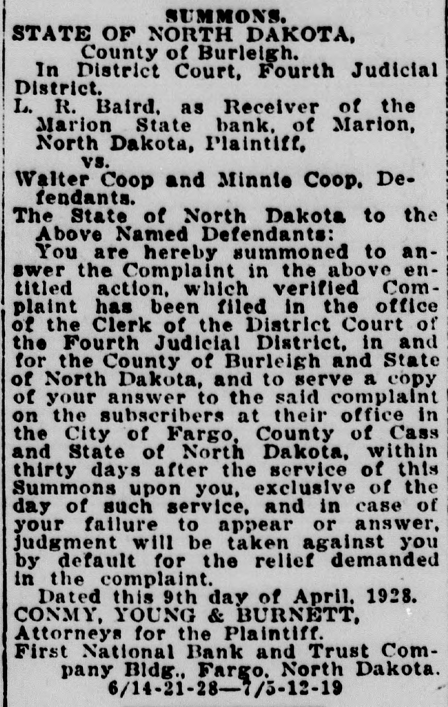 SUMMONS. STATE OF NORTH DAKOTA, County of Burleigh. In District Court, Fourth Judicial District. L. R. Baird, as Receiver of the Marion State bank. of Marion, North Dakota. Plaintiff, ve Walter Coop and Minnie Coop. Decommants. The State of North Dakota to the Above Named Defendants: You are hereby summoned to answer the Complaint in the above entitled action, which verified Complaint has been filed in the office of the Clerk of the District Court of the Fourth Judicial District, in and for the County of Burleigh and State of North Dakota, and to serve a copy of your answer to the said complaint on the subscribers at their office in the City of Fargo, County of Cass and State of North Dakota, within thirty days after the service of this Summons upon you, exclusive of the day of such service, and in case of your failure to appear or answer, judgment will be taken against you by default for the relief demanded in the complaint. Dated this 9th day of April. 1928. CONMY. YOUNG & BURNETT. Attorneys for the Plaintiff. First National Bank and Trust Company Bldg., Fargo, North Dakota. 6/14-21-28-7/5-12-19