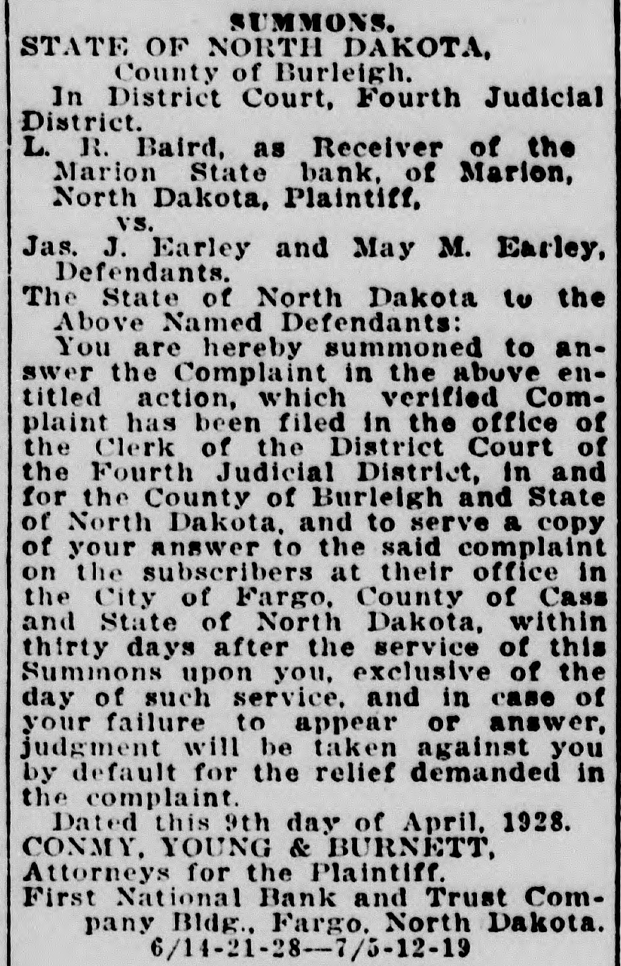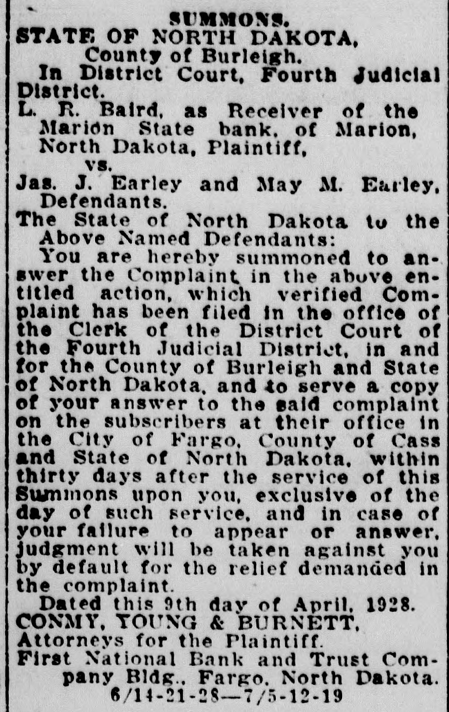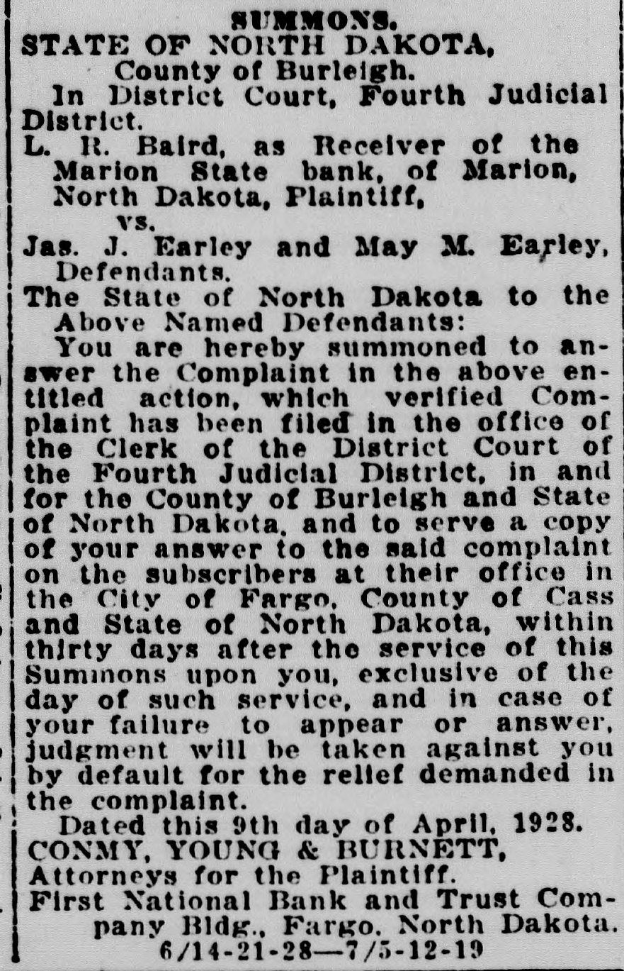 SUMMONS. STATE OF NORTH DAKOTA, County of Burleigh. In District Court, Fourth Judicial District. L. R. Baird, as Receiver of the Marion State bank, of Marion, North Dakota, Plaintiff, vs. Jas. J. Earley and May M. Earley, Defendants. The State of North Dakota to the Above Named Defendants: You are hereby summoned to answer the Complaint in the above entitled action, which verified Complaint has been filed in the office of the Clerk of the District Court of the Fourth Judicial District, in and for the County of Burleigh and State of North Dakota, and to serve a copy of your answer to the said complaint on the subscribers at their office in the City of Fargo, County of Cass and State of North Dakota, within thirty days after the service of this Summons upon you, exclusive of the day of such service, and in case of your failure to appear or answer, judgment will be taken against you by default for the relief demanded in the complaint. Dated this 9th day of April, 1928. CONMY, YOUNG & BURNETT, Attorneys for the Plaintiff. First National Bank and Trust Company Bldg., Fargo. North Dakota. 6/14-21-28-7/5-12-19