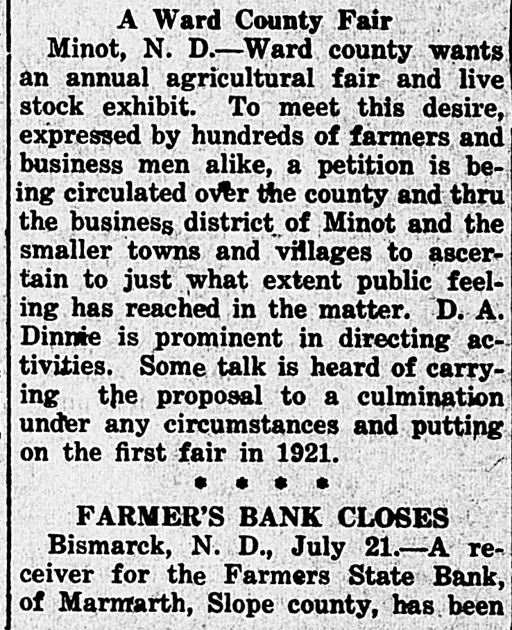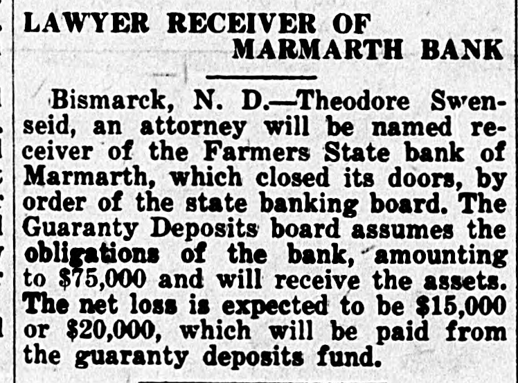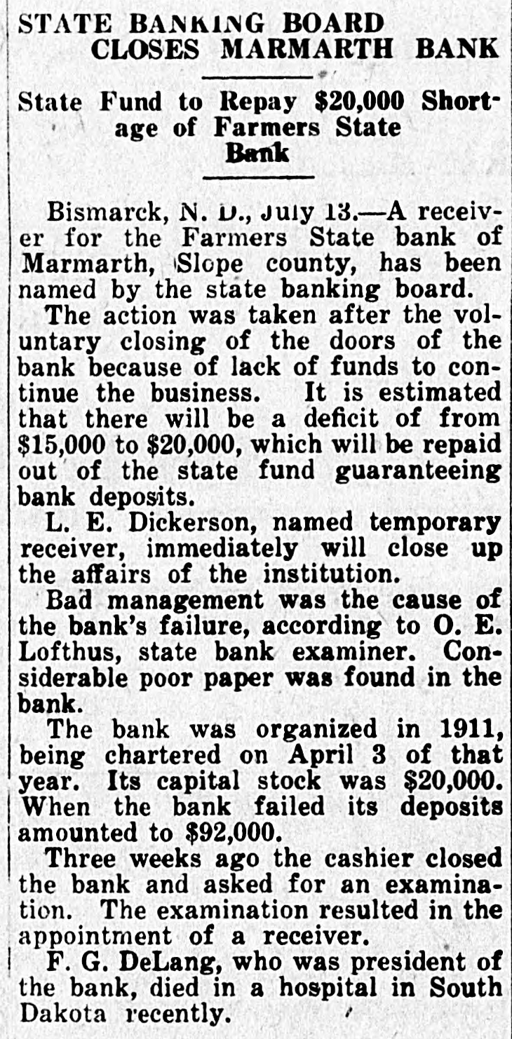 NAME RECEIVER OF STATE BANK AT MARMARTH State Banking Board Acts When Shortage in Funds is Disclosed Through Examination A receiver for the Farmers' State Bank, at Marmarth, Slope county, has been named by the state banking board. The action was taken after thee voluntary closing of the doors of the bank because of lack of funds to coninue the business. It is estimated that there will be a deficit of from $15,000 to $20,000, which will be paid out of the state fund guaranteeing bank deposits. L. E. Dickerson. named temporary receiver. immediately will close up the ffairs of the institution. Bad management was the cause of the bank's failure, according to O. E. Loftus, state bank examiner. Considerable poor paper was found in the bank. The bank was organized in 1911, beng chartered on April 3 of that year. Its capital stock was $20,000. When he bank failed its deposits amounted to $92,000. 1 hree weeks ago the cashier closed he bank and asked for an examination The examination resulted in the appointment of a receiver. F. G. DeLange, who was president of the bank, died in a hospital in South Dakota, recently.