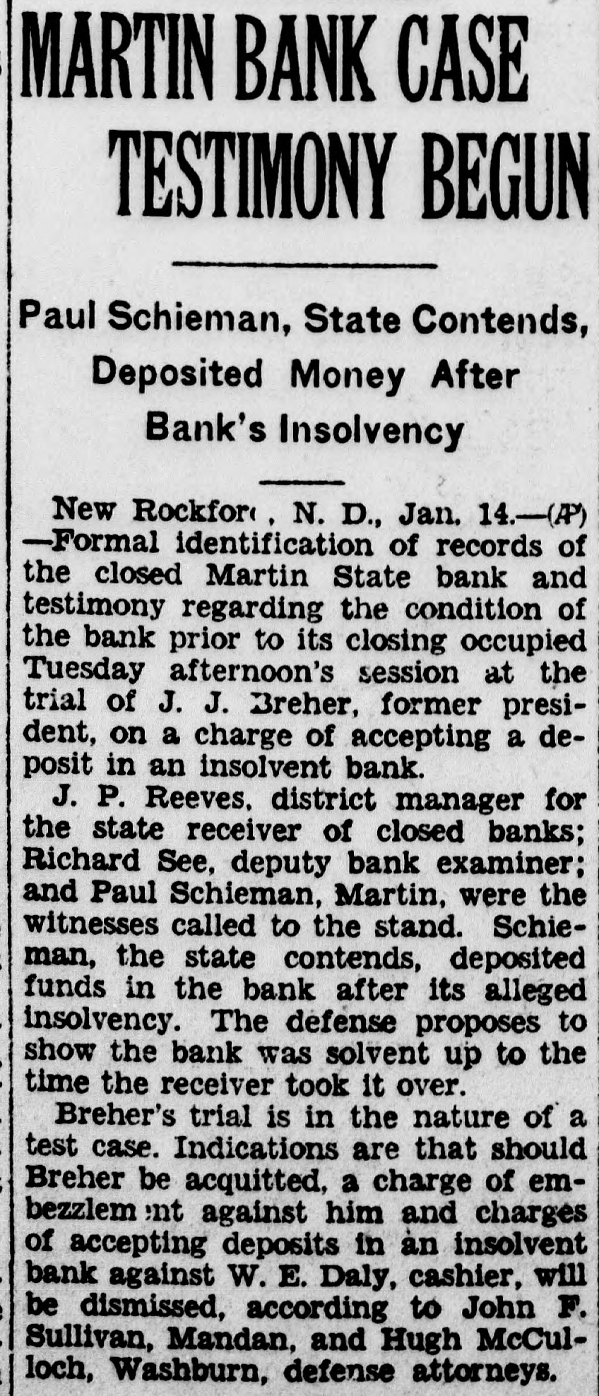 MARTIN BANK CASE TESTIMONY BEGUN Paul Schieman, State Contends, Deposited Money After Bank's Insolvency New Rockford, N. D., Jan. 14.-(P) -Formal identification of records of the closed Martin State bank and testimony regarding the condition of the bank prior to its closing occupied Tuesday afternoon's session at the trial of J. J. Breher, former president, on a charge of accepting a deposit in an insolvent bank. J. P. Reeves. district manager for the state receiver of closed banks; Richard See, deputy bank examiner; and Paul Schieman, Martin, were the witnesses called to the stand. Schieman, the state contends, deposited funds in the bank after its alleged insolvency. The defense proposes to show the bank was solvent up to the time the receiver took it over. Breher's trial is in the nature of a test case. Indications are that should Breher be acquitted, a charge of embezzlem ent against him and charges of accepting deposits in an insolvent bank against W. E. Daly, cashier, will be dismissed, according to John F. Sullivan, Mandan, and Hugh McCulloch, Washburn, defense attorneys.
