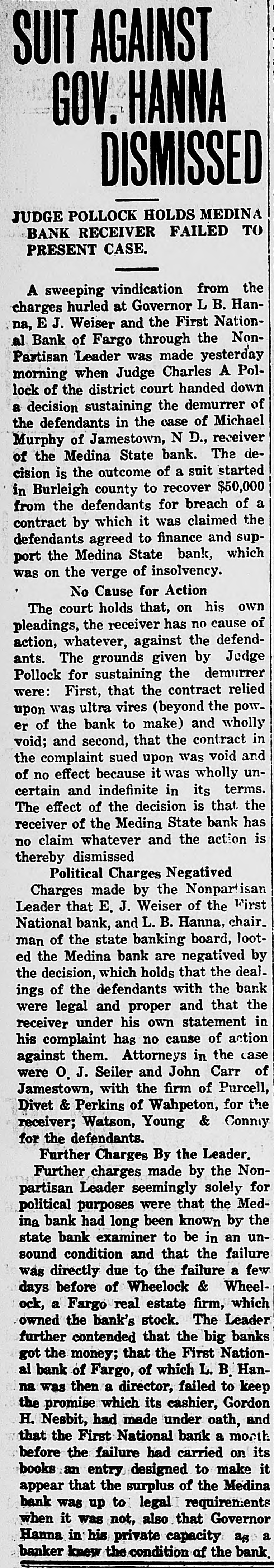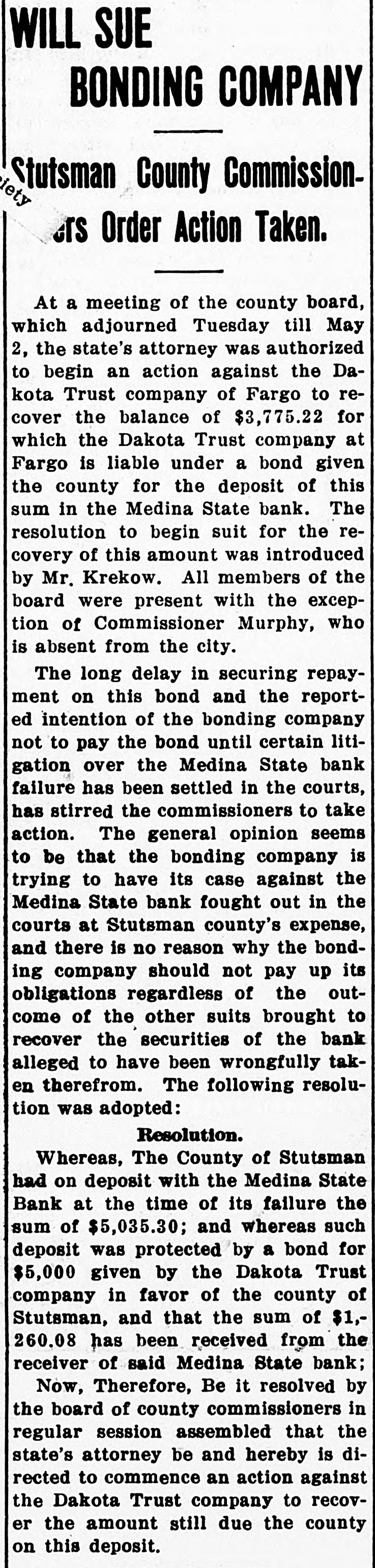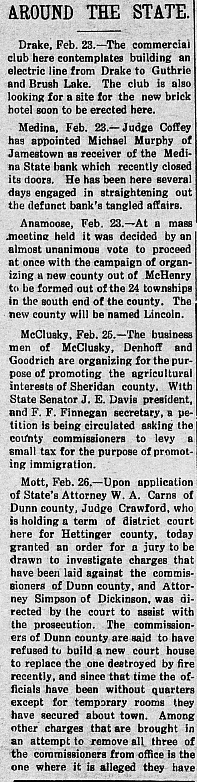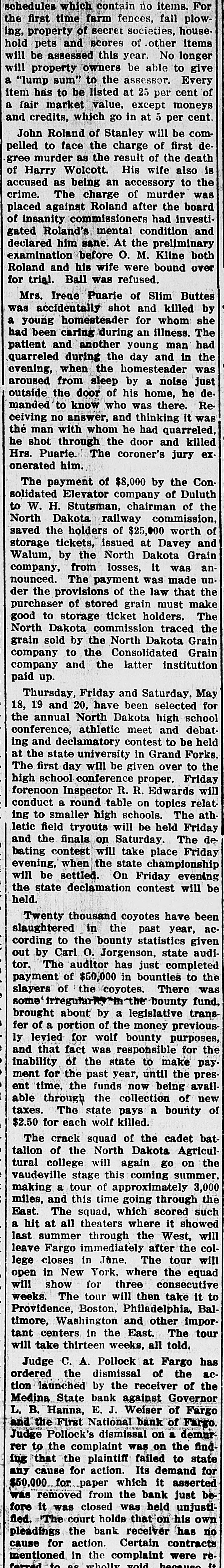 schedules which contain no items. For the first time farm fences, fall plowing, property of secret societies, household pets and scores of other items will be assessed this year. No longer will property owners be able to give a "lump sum" to the assessor. Every item has to be listed at 25 per cent of a fair market value, except moneys and credits, which go in at 5 per cent. John Roland of Stanley will be compelled to face the charge of first de gree murder as the result of the death of Harry Wolcott. His wife also is accused as being an accessory to the crime. The charge of murder was placed against Roland after the board of insanity commissioners had investigated Roland's mental condition and declared him sane. At the preliminary examination before O. M. Kline both Roland and his wife were bound over for trial. Bail was refused. Mrs. Irene Puarie of Slim Buttes was accidentally shot and killed by a young homesteader for whom she had been caring during an illness. The patient and another young man had quarreled during the day and in the evening, when the homesteader was aroused from sleep by a noise just outside the door of his home, he demanded to know who was there. Receiving no answer, and thinking it was the man with whom he had quarreled, he shot through the door and killed Hrs. Puarie. The coroner's jury exonerated him. The payment of $8,000 by the Consolidated Elevator company of Duluth to W. H. Stutsman, chairman of the North Dakota railway commission, saved the holders of $25,000 worth of storage tickets, issued at Davey and Walum, by the North Dakota Grain company, from losses, it was an nounced. The payment was made under the provisions of the law that the purchaser of stored grain must make good to storage ticket holders. The North Dakota commission traced the grain sold by the North Dakota Grain company to the Consolidated Grain company and the latter institution paid up. Thursday, Friday and Saturday, May 18, 19 and 20, have been selected for the annual North Dakota high school conference, athletic meet and debating and declamatory contest to be held at the state university in Grand Forks. The first day will be given over to the high school conference proper. Friday forenoon Inspector R. R. Edwards will conduct a round table on topics relating to smaller high schools. The athletic field tryouts will be held Friday and the finals on Saturday. The debating contest will take place Friday evening, when the state championship will be settled. On Friday evening the state declamation contest will be held. Twenty thousand coyotes have been slaughtered in the past year, according to the bounty statistics given out by Carl O. Jorgenson, state auditor. The auditor has just completed payment of $50,000 in bounties to the slayers of the coyotes. There was some' irregularity" in the bounty fund, brought about by a legislative transfer of a portion of the money previously levied for wolf bounty purposes, and that fact was responsible for the inability of the state to make payment for the past year, until the present time, the funds now being available through the collection of new taxes. The state pays a bounty of $2.50 for each wolf killed. The crack squad of the cadet battalion of the North Dakota Agricultural college will again go on the vaudeville stage this coming summer, making a tour of approximately 3,000 miles, and this time going through the East. The squad, which scored such a hit at all theaters where it showed last summer through the West, will leave Fargo immediately after the college closes in June. The tour will open in New York, where the equad will show for three consecutive weeks. The tour will then take it to Providence, Boston, Philadelphia, Baltimore, Washington and other important centers in the East. The tour will take thirteen weeks, all told. Judge C. A. Pollock at Fargo has ordered the dismissal of the action launched by the receiver of the Medina State bank against Governor L. B. Hanna, E. J. Weiser of Fargo and the First National bank of Fargo. Judge Pollock's dismissal on a demur rer to the complaint was on the find ing that the plaintiff failed to state any cause for action. Its demand for $50,000 for paper which it asserted was removed from the bank just before it was closed was held unjustified. The court holds that on his own pleadings the bank receiver has no cause for action Certain contracts