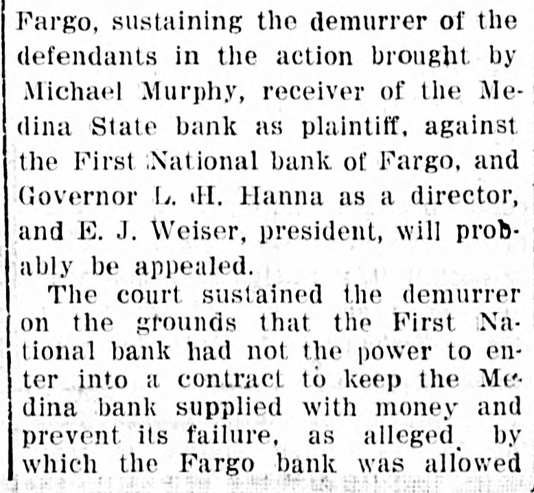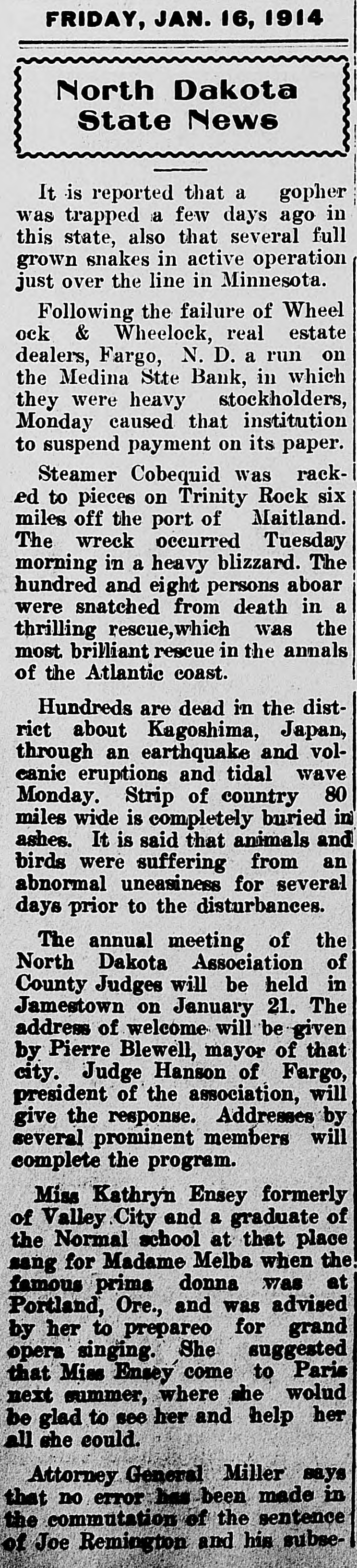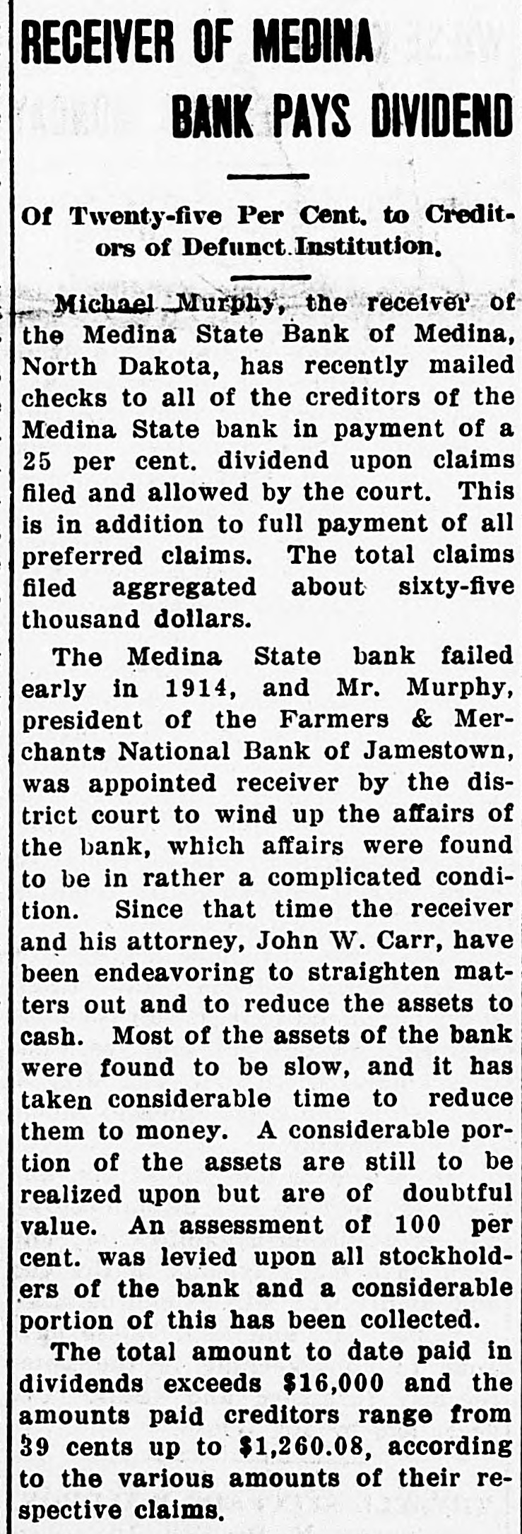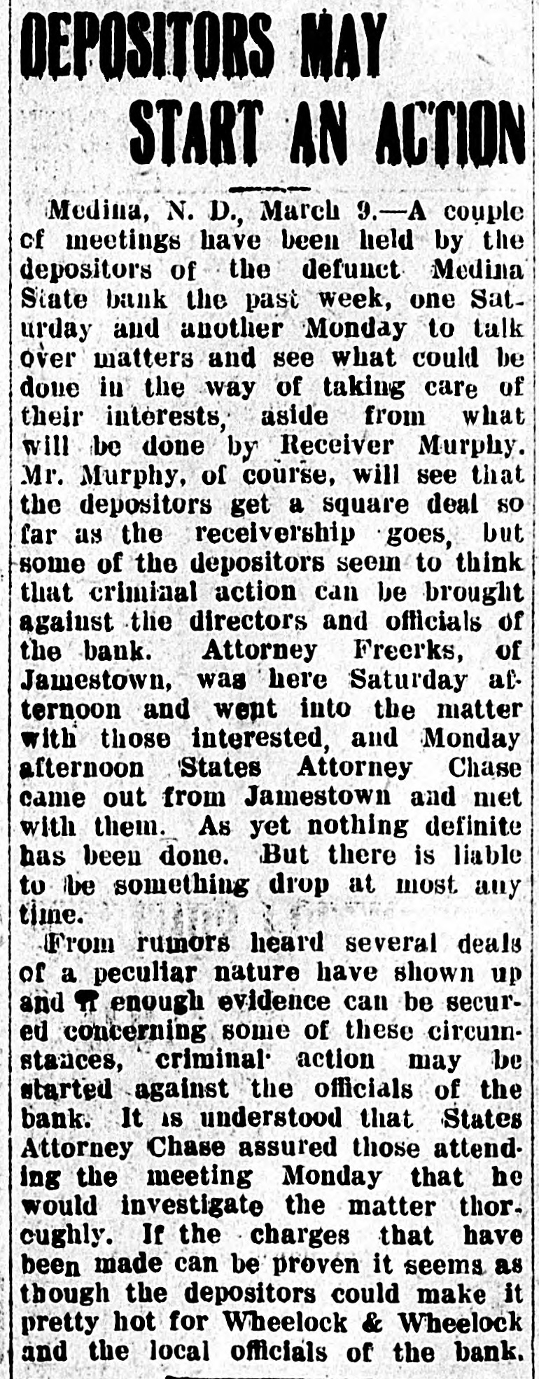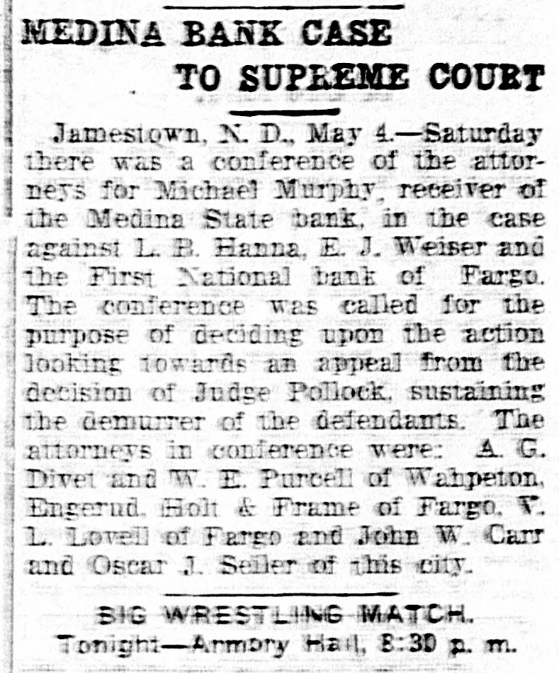 schedules which contain no items. For the first time farm fences, fall plowing, property of secret societies, household pets and scores of other items will be assessed this year. No longer will property owners be able to give a "lump sum" to the assessor. Every item has to be listed at 25 per cent of a fair market value, except moneys and credits, which go in at 5 per cent. John Roland of Stanley will be compelled to face the charge of first de gree murder as the result of the death of Harry Wolcott. His wife also is accused as being an accessory to the crime. The charge of murder was placed against Roland after the board of insanity commissioners had investigated Roland's mental condition and declared him sane. At the preliminary examination before O. M. Kline both Roland and his wife were bound over for trial. Bail was refused. Mrs. Irene Puarie of Slim Buttes was accidentally shot and killed by a young homesteader for whom she had been caring during an illness. The patient and another young man had quarreled during the day and in the evening, when the homesteader was aroused from sleep by a noise just outside the door of his home, he demanded to know who was there. Receiving no answer, and thinking it was the man with whom he had quarreled, he shot through the door and killed Hrs. Puarie. The coroner's jury exonerated him. The payment of $8,000 by the Consolidated Elevator company of Duluth to W. H. Stutsman, chairman of the North Dakota railway commission, saved the holders of $25,000 worth of storage tickets, issued at Davey and Walum, by the North Dakota Grain company, from losses, it was an nounced. The payment was made under the provisions of the law that the purchaser of stored grain must make good to storage ticket holders. The North Dakota commission traced the grain sold by the North Dakota Grain company to the Consolidated Grain company and the latter institution paid up. Thursday, Friday and Saturday, May 18, 19 and 20, have been selected for the annual North Dakota high school conference, athletic meet and debating and declamatory contest to be held at the state university in Grand Forks. The first day will be given over to the high school conference proper. Friday forenoon Inspector R. R. Edwards will conduct a round table on topics relating to smaller high schools. The athletic field tryouts will be held Friday and the finals on Saturday. The debating contest will take place Friday evening, when the state championship will be settled. On Friday evening the state declamation contest will be held. Twenty thousand coyotes have been slaughtered in the past year, according to the bounty statistics given out by Carl O. Jorgenson, state auditor. The auditor has just completed payment of $50,000 in bounties to the slayers of the coyotes. There was some' irregularity" in the bounty fund, brought about by a legislative transfer of a portion of the money previously levied for wolf bounty purposes, and that fact was responsible for the inability of the state to make payment for the past year, until the present time, the funds now being available through the collection of new taxes. The state pays a bounty of $2.50 for each wolf killed. The crack squad of the cadet battalion of the North Dakota Agricultural college will again go on the vaudeville stage this coming summer, making a tour of approximately 3,000 miles, and this time going through the East. The squad, which scored such a hit at all theaters where it showed last summer through the West, will leave Fargo immediately after the college closes in June. The tour will open in New York, where the equad will show for three consecutive weeks. The tour will then take it to Providence, Boston, Philadelphia, Baltimore, Washington and other important centers in the East. The tour will take thirteen weeks, all told. Judge C. A. Pollock at Fargo has ordered the dismissal of the action launched by the receiver of the Medina State bank against Governor L. B. Hanna, E. J. Weiser of Fargo and the First National bank of Fargo. Judge Pollock's dismissal on a demur rer to the complaint was on the find ing that the plaintiff failed to state any cause for action. Its demand for $50,000 for paper which it asserted was removed from the bank just before it was closed was held unjustified. The court holds that on his own pleadings the bank receiver has no cause for action Certain contracts