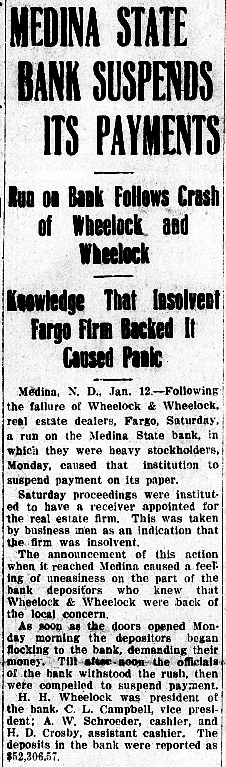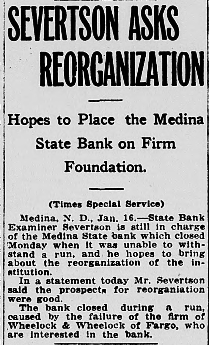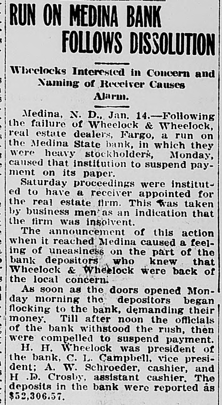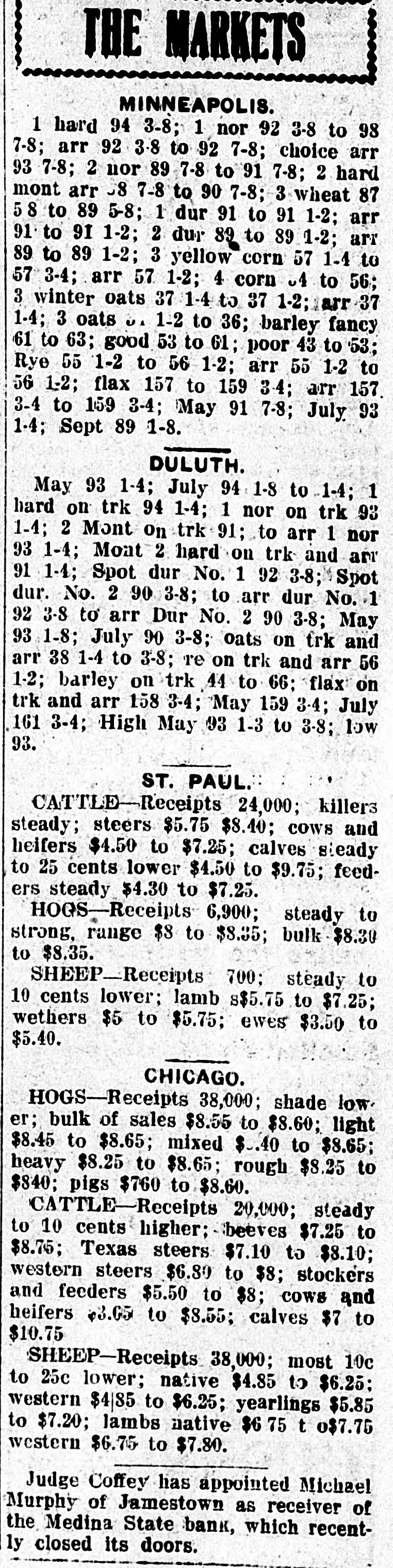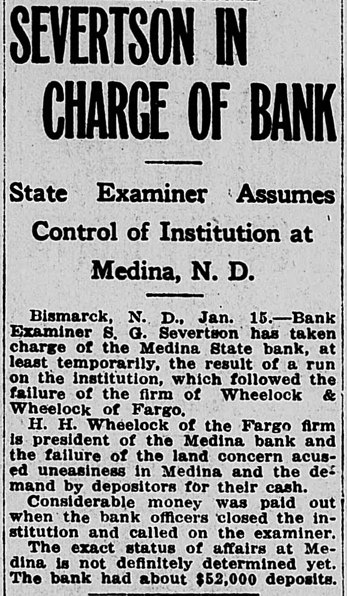 schedules which contain no items. For the first time farm fences, fall plowing, property of secret societies, household pets and scores of other items will be assessed this year. No longer will property owners be able to give a "lump sum" to the assessor. Every item has to be listed at 25 per cent of a fair market value, except moneys and credits, which go in at 5 per cent. John Roland of Stanley will be compelled to face the charge of first de gree murder as the result of the death of Harry Wolcott. His wife also is accused as being an accessory to the crime. The charge of murder was placed against Roland after the board of insanity commissioners had investigated Roland's mental condition and declared him sane. At the preliminary examination before O. M. Kline both Roland and his wife were bound over for trial. Bail was refused. Mrs. Irene Puarie of Slim Buttes was accidentally shot and killed by a young homesteader for whom she had been caring during an illness. The patient and another young man had quarreled during the day and in the evening, when the homesteader was aroused from sleep by a noise just outside the door of his home, he demanded to know who was there. Receiving no answer, and thinking it was the man with whom he had quarreled, he shot through the door and killed Hrs. Puarie. The coroner's jury exonerated him. The payment of $8,000 by the Consolidated Elevator company of Duluth to W. H. Stutsman, chairman of the North Dakota railway commission, saved the holders of $25,000 worth of storage tickets, issued at Davey and Walum, by the North Dakota Grain company, from losses, it was an nounced. The payment was made under the provisions of the law that the purchaser of stored grain must make good to storage ticket holders. The North Dakota commission traced the grain sold by the North Dakota Grain company to the Consolidated Grain company and the latter institution paid up. Thursday, Friday and Saturday, May 18, 19 and 20, have been selected for the annual North Dakota high school conference, athletic meet and debating and declamatory contest to be held at the state university in Grand Forks. The first day will be given over to the high school conference proper. Friday forenoon Inspector R. R. Edwards will conduct a round table on topics relating to smaller high schools. The athletic field tryouts will be held Friday and the finals on Saturday. The debating contest will take place Friday evening, when the state championship will be settled. On Friday evening the state declamation contest will be held. Twenty thousand coyotes have been slaughtered in the past year, according to the bounty statistics given out by Carl O. Jorgenson, state auditor. The auditor has just completed payment of $50,000 in bounties to the slayers of the coyotes. There was some' irregularity" in the bounty fund, brought about by a legislative transfer of a portion of the money previously levied for wolf bounty purposes, and that fact was responsible for the inability of the state to make payment for the past year, until the present time, the funds now being available through the collection of new taxes. The state pays a bounty of $2.50 for each wolf killed. The crack squad of the cadet battalion of the North Dakota Agricultural college will again go on the vaudeville stage this coming summer, making a tour of approximately 3,000 miles, and this time going through the East. The squad, which scored such a hit at all theaters where it showed last summer through the West, will leave Fargo immediately after the college closes in June. The tour will open in New York, where the equad will show for three consecutive weeks. The tour will then take it to Providence, Boston, Philadelphia, Baltimore, Washington and other important centers in the East. The tour will take thirteen weeks, all told. Judge C. A. Pollock at Fargo has ordered the dismissal of the action launched by the receiver of the Medina State bank against Governor L. B. Hanna, E. J. Weiser of Fargo and the First National bank of Fargo. Judge Pollock's dismissal on a demur rer to the complaint was on the find ing that the plaintiff failed to state any cause for action. Its demand for $50,000 for paper which it asserted was removed from the bank just before it was closed was held unjustified. The court holds that on his own pleadings the bank receiver has no cause for action Certain contracts