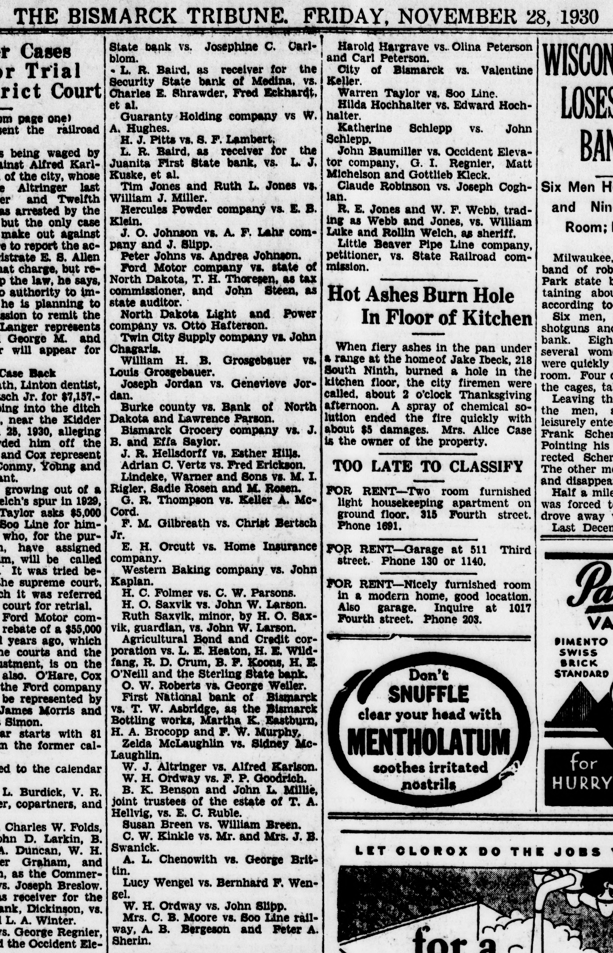 # THE BISMARCK TRIBUNE. FRIDAY, NOVEMBER 28, 1930 r Cases or Trial rict Court State bank vs. Josephine C. Carl-blom. • L. R. Baird, as receiver for the Security State bank of Medina, vs. Charles E. Shrawder, Fred Eckhardt, et al. Guaranty Holding company vs W. A. Hughes. H. J. Pitts vs. S. F. Lambert. L. R. Baird, as receiver for the Juanita First State bank, vs. L. J. Kuske, et al. Tim Jones and Ruth L. Jones vs. William J. Miller. Hercules Powder company vs. E. B. Klein. J. O. Johnson vs. A. F. Lahr company and J. Slipp. Peter Johns vs. Andrea Johnson. Ford Motor company vs. state of North Dakota, T. H. Thoresen, as tax commissioner, and John Steen, as state auditor. North Dakota Light and Power company vs. Otto Hafterson. Twin City Supply company vs. John Chagaris. William H. B. Grosgebauer vs. Louis Grosgebauer. Joseph Jordan vs. Genevieve Jordan. Burke county vs. Bank of North Dakota and Lawrence Parson. Bismarck Grocery company vs. J. B. and Effa Saylor. J. R. Hellsdorff vs. Esther Hills. Adrian C. Vertz vs. Fred Erickson, Lindeke, Warner and Sons vs. M. I. Rigler, Sadie Rosen and M. Rosen. G. R. Thompson vs. Keller A. Mc-Cord. F. M. Gilbreath vs. Christ Bertsch Jr. E. H. Orcutt vs. Home Insurance company. Western Baking company vs. John Kaplan. H. C. Folmer vs. C. W. Parsons. H. O. Saxvik vs. John W. Larson. Ruth Saxvik, minor, by H. O. Saxvik, guardian, vs. John W. Larson. Agricultural Bond and Credit corporation vs. L. E. Heaton, H. E. Wild-fang, R. D. Crum, B. F. Koons, H. E. O'Neill and the Sterling State bank. O. W. Roberts vs. George Weiler. First National bank of Bismarck vs. T. W. Asbridge, as the Bismarck Bottling works, Martha K. Eastburn, H. A. Brocopp and F. W. Murphy, Zelda McLaughlin vs. Sidney McLaughlin. W. J. Altringer vs. Alfred Karlson. W. H. Ordway vs. F. P. Goodrich. B. K. Benson and John L. Millie, joint trustees of the estate of T. A. Hellvig, vs. E. C. Ruble. Susan Breen vs. William Breen. C. W. Kinkle vs. Mr. and Mrs. J. B. Swanick. A. L. Chenowith vs. George Brittin. Lucy Wengel vs. Bernhard F. Wengel. W. H. Ordway vs. John Slipp. Mrs. C. B. Moore vs. Soo Line railway, A. B. Bergeson and Peter A. Sherin. Harold Hargrave vs.. Olina Peterson and Carl Peterson. City of Bismarck vs. Valentine Keller. Warren Taylor vs. Soo Line. Hilda Hochhalter vs. Edward Hochhalter. Katherine Schlepp VS. John Schlepp. John Baumiller vs. Occident Elevator company, G. I. Regnier, Matt Michelson and Gottlieb Kleck. Claude Robinson vs. Joseph Coghlan. R. E. Jones and W. F. Webb, trading as Webb and Jones, vs. William Luke and Rollin Welch, as sheriff. Little Beaver Pipe Line company, petitioner, vs. State Railroad commission. # Hot Ashes Burn Hole # In Floor of Kitchen When fiery ashes in the pan under & range at the home of Jake Ibeck, 218 South Ninth, burned a hole in the kitchen floor, the city firemen were called, about 2 o'clock Thanksgiving afternoon. A spray of chemical solution ended the fire quickly with about $5 damages. Mrs. Alice Case is the owner of the property. # TOO LATE TO CLASSIFY FOR RENT-Two room furnished light housekeeping apartment on ground floor. 315 Fourth street. Phone 1691. FOR RENT-Garage at 511 Third street. Phone 130 or 1140. FOR RENT-Nicely furnished room in a modern home, good location. Also garage. Inquire at 1017 Fourth street. Phone 203. WISCON LOSES BAN Six Men H and Nin Room; Milwaukee, band of rob Park state b taining abou according to Six men, shotguns and bank. Eigh several wom were quickly room. Four c the cages, ta Leaving th the men, leisurely ente Frank Scher Pointing his rected Scher The other mo and disappea Half a mile was forced t drove away Last Decen Pa VA PIMENTO SWISS BRICK STANDARD for HURRY LET CLOROX DO THE JOBS for a