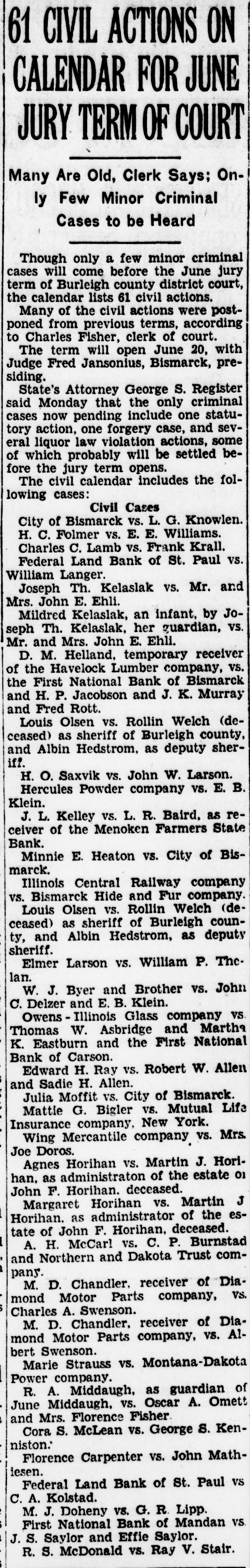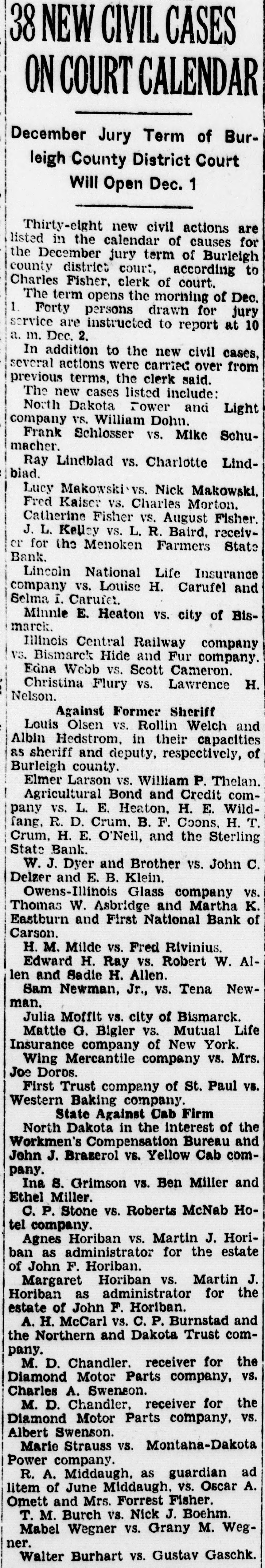 38 NEW CIVIL CASES ON COURT CALENDAR December Jury Term of Burleigh County District Court Will Open Dec. 1 Thirty-eight new civil actions are listed in the calendar of causes for the December jury term of Burleigh county district court, according to Charles Fisher, clerk of court. The term opens the morning of Dec. 1. Forty persons drawn for jury service are instructed to report at 10 a. m. Dec. 2. In addition to the new civil cases, several actions were carried over from previous terms, the clerk said. The new cases listed include: North Dakota Tower and Light company vs. William Dohn. Frank Schlosser vs. Mike Schumacher. Ray Lindblad vs. Charlotte Lindbiad. Lucy Makowski Nick Makowski. Fred Kaiser VS. Charles Morton. Catherine Fisher vs. August Fisher. J. L. Kelley VS. L. R. Baird, receivor for the Menoken Farmers State Bank. Lincoln National Life Insurance company VS. Louise H. Carufel and Selma I. Carufei, Minnie E. Heaton vs. city of Bismarci. Illinois Central Railway company vs. Bismarck Hide and Fur company. Edna Webb vs. Scott Cameron. Christina Flury VS. Lawrence H. Nelson. Against Former Sheriff Louis Olsen vs. Rollin Welch and Albin Hedstrom, in their capacities as sheriff and deputy, respectively, of Burleigh county. Elmer Larson vs. William P. Thelan. Agricultural Bond and Credit company VS. L. E. Heaton. H. E. Wildfang, R. D. Crum. B. F. Coons, H. T. Crum, H. E. O'Neil, and the Sterling State Bank. W. J. Dyer and Brother vs. John C. Delzer and E. B. Klein. Owens-Illinois Glass company vs. Thomas W. Asbridge and Martha K. Eastburn and First National Bank of Carson. H. M. Milde vs. Fred Rivinius. Edward H. Ray vs. Robert W. Allen and Sadie H. Allen. Sam Newman, Jr., vs. Tena Newman. Julia Moffit vs. city of Bismarck. Mattie G. Bigler vs. Mutual Life Insurance company of New York. Wing Mercantile company vs. Mrs. Joe Doros. First Trust company of St. Paul VS. Western Baking company. State Against Cab Firm North Dakota in the interest of the Workmen's Compensation Bureau and John J. Brazerol vs. Yellow Cab company. Ina 8. Grimson vs. Ben Miller and Ethel Miller. C. P. Stone vs. Roberts McNab Hotel company. Agnes Horiban vs. Martin J. Horiban as administrator for the estate of John F. Horiban. Margaret Horiban vs. Martin J. Horiban as administrator for the estate of John F. Horiban. A. H. McCarl vs. C. P. Burnstad and the Northern and Dakota Trust company. M. D. Chandler. receiver for the Diamond Motor Parts company, vs. Charles A. Swenson. M. D. Chandler, receiver for the Diamond Motor Parts company, vs. Albert Swenson. Marie Strauss vs. Montana-Dakota Power company. R. A. Middaugh, as guardian ad litem of June Middaugh, vs. Oscar A. Omett and Mrs. Forrest Fisher. T. M. Burch vs. Nick J. Boehm. Mabel Wegner vs. Grany M. Wegner. Walter Burhart vs. Gustav Gaschk.