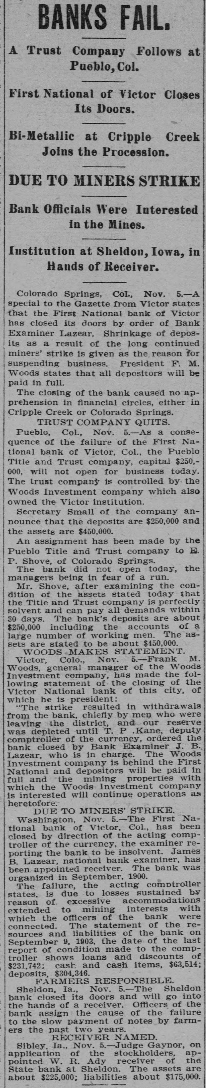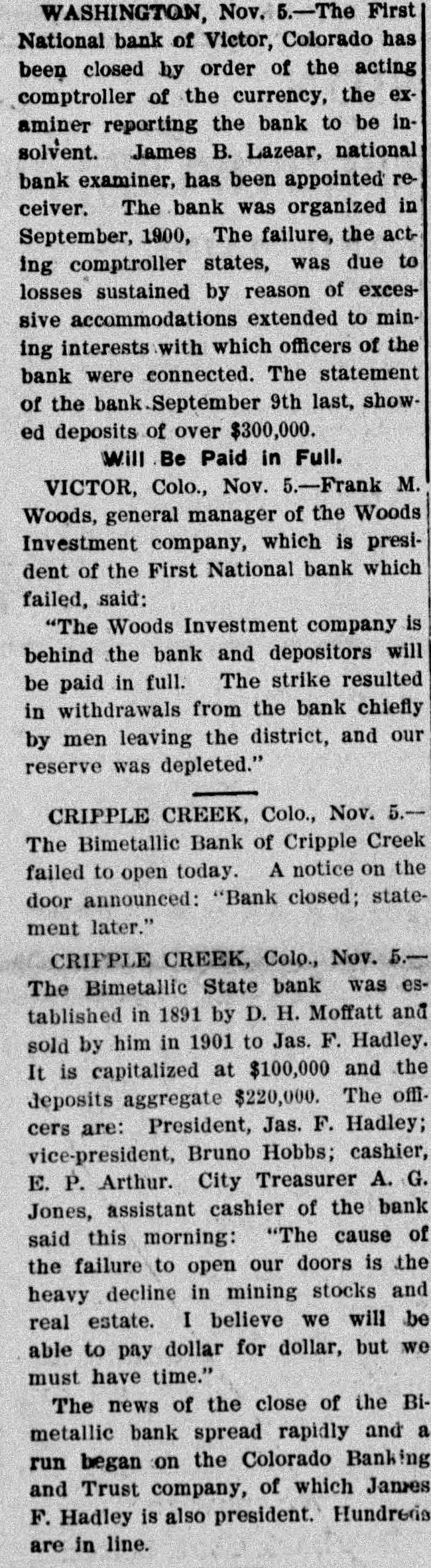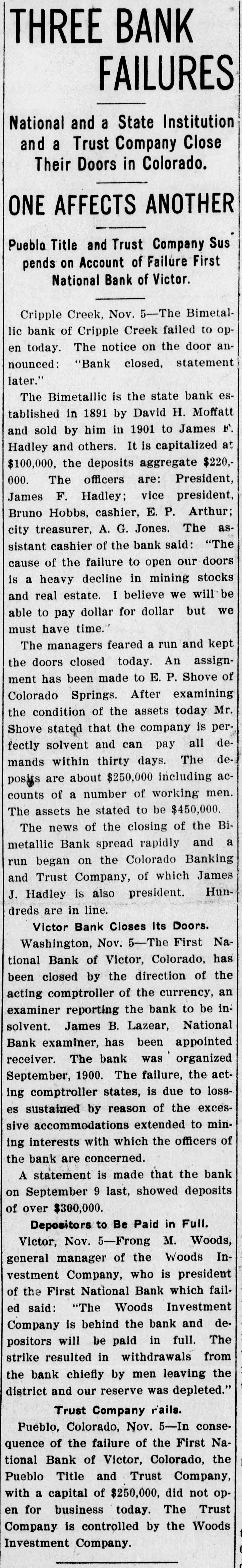 THREE BANK FAILURES National and a State Institution and a Trust Company Close Their Doors in Colorado. ONE AFFECTS ANOTHER Pueblo Title and Trust Company Sus pends on Account of Failure First National Bank of Victor. Cripple Creek, Nov. 5-The Bimetallic bank of Cripple Creek failed to open today. The notice on the door announced: "Bank closed, statement later." The Bimetallic is the state bank established in 1891 by David H. Moffatt and sold by him in 1901 to James F. Hadley and others. It is capitalized at $100,000, the deposits aggregate $220,000. The officers are: President, James F. Hadley; vice president, Bruno Hobbs, cashier, E. P. Arthur; city treasurer, A. G. Jones. The assistant cashier of the bank said: "The cause of the failure to open our doors is a heavy decline in mining stocks and real estate. I believe we will be able to pay dollar for dollar but we must have time." The managers feared a run and kept the doors closed today. An assignment has been made to E. P. Shove of Colorado Springs. After examining the condition of the assets today Mr. Shove stated that the company is perfectly solvent and can pay all demands within thirty days. The deposits are about $250,000 including accounts of a number of working men. The assets he stated to be $450,000. The news of the closing of the Bimetallic Bank spread rapidly and a run began on the Colorado Banking and Trust Company, of which James J. Hadley is also president. Hundreds are in line. Victor Bank Closes Its Doors. Washington, Nov. 5-The First National Bank of Victor, Colorado, has been closed by the direction of the acting comptroller of the currency, an examiner reporting the bank to be insolvent. James B. Lazear, National Bank examiner, has been appointed receiver. The bank was organized September, 1900. The failure, the acting comptroller states, is due to losses sustained by reason of the excessive accommodations extended to mining interests with which the officers of the bank are concerned. A statement is made that the bank on September 9 last, showed deposits of over $300,000. Depositors to Be Paid in Full. Victor, Nov. 5-Frong M. Woods, general manager of the Woods Investment Company, who is president of the First National Bank which failed said: "The Woods Investment Company is behind the bank and de positors will be paid in full. The strike resulted in withdrawals from the bank chiefly by men leaving the district and our reserve was depleted." Trust Company rails. Pueblo, Colorado, Nov. 5-In consequence of the failure of the First National Bank of Victor, Colorado, the Pueblo Title and Trust Company, with a capital of $250,000, did not open for business today. The Trust Company is controlled by the Woods Investment Company.