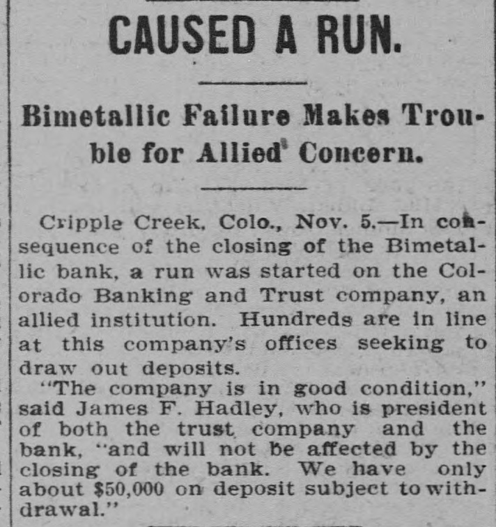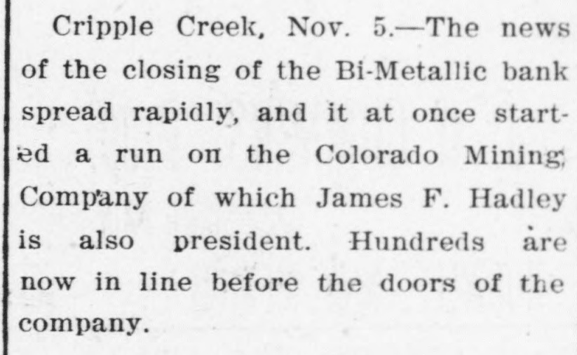 Cripple Creek, Nov. 5.-The news of the closing of the Bi-Metallic bank spread rapidly, and it at once started a run on the Colorado Mining Company of which James F. Hadley is also president. Hundreds are now in line before the doors of the company.