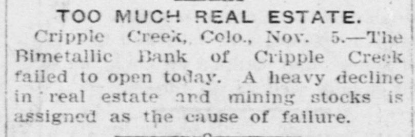 TOO MUCH REAL ESTATE. Cripple Creek, Colo., Nov. 5.-The Bimetallic Bank of Cripple Creek failed to open today. A heavy decline in real estate and mining stocks is assigned as the cause of failure.