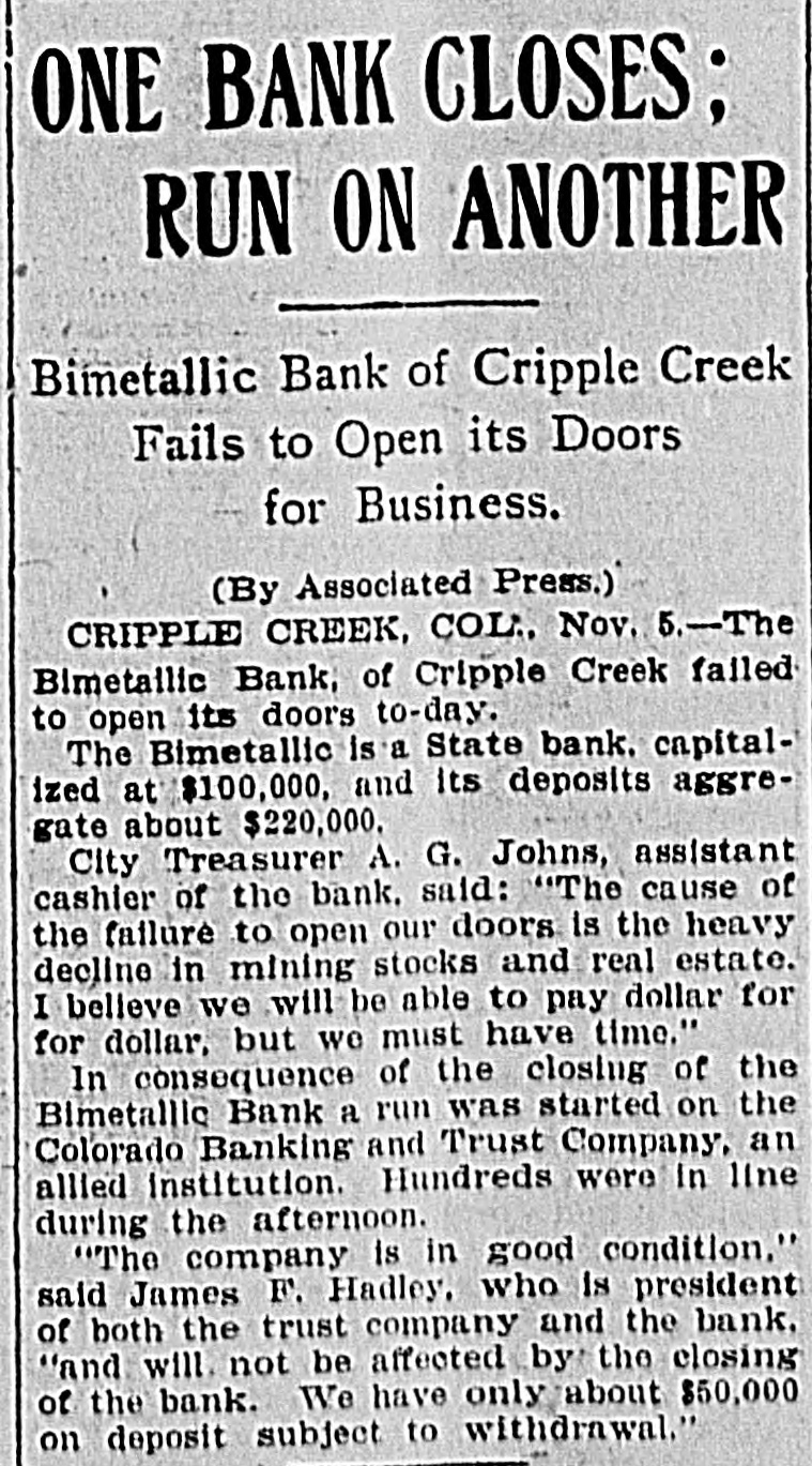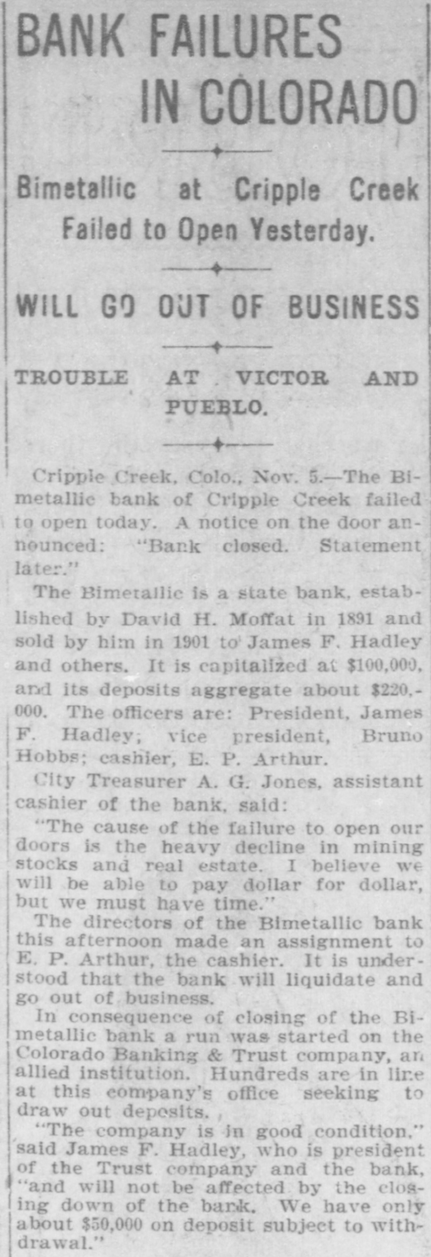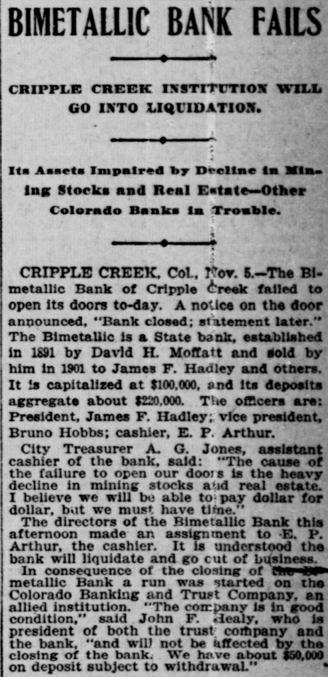 BIMETALLIC BANK FAILS CRIPPLE CREEK INSTITUTION WILL GO INTO LIQUIDATION. Its Assets Impaired by Decline in Mining Stocks and Real Estate-Other Colorado Banks in Trouble. CRIPPLE CREEK, Col., Nov. 5.-The Bimetallic Bank of Cripple Creek failed to open its doors to-day. A notice on the door announced, "Bank closed; statement later." The Bimetallic is a State bank, established in 1891 by David H. Moffatt and sold by him in 1901 to James F. Hadley and others. It is capitalized at $100,000, and its deposits aggregate about $220,000. The officers are: President, James F. Hadley; vice president, Bruno Hobbs; cashier, E. P. Arthur. City Treasurer A. G. Jones, assistant cashier of the bank, said: "The cause of the failure to open our doors is the heavy decline in mining stocks and real estate. I believe we will be able to pay dollar for dollar, but we must have time." The directors of the Bimetallic Bank this afternoon made an assignment to -E. P. Arthur, the cashier. It is understood the bank will liquidate and go cut of business. In consequence of the closing of the metallic Bank a run was started on the Colorado Banking and Trust Company, an allied institution. "The company is in good condition," said John F. Healy, who is president of both the trust company and the bank, "and will not be affected by the closing of the bank. We have about $50,000 on deposit subject to withdrawal."