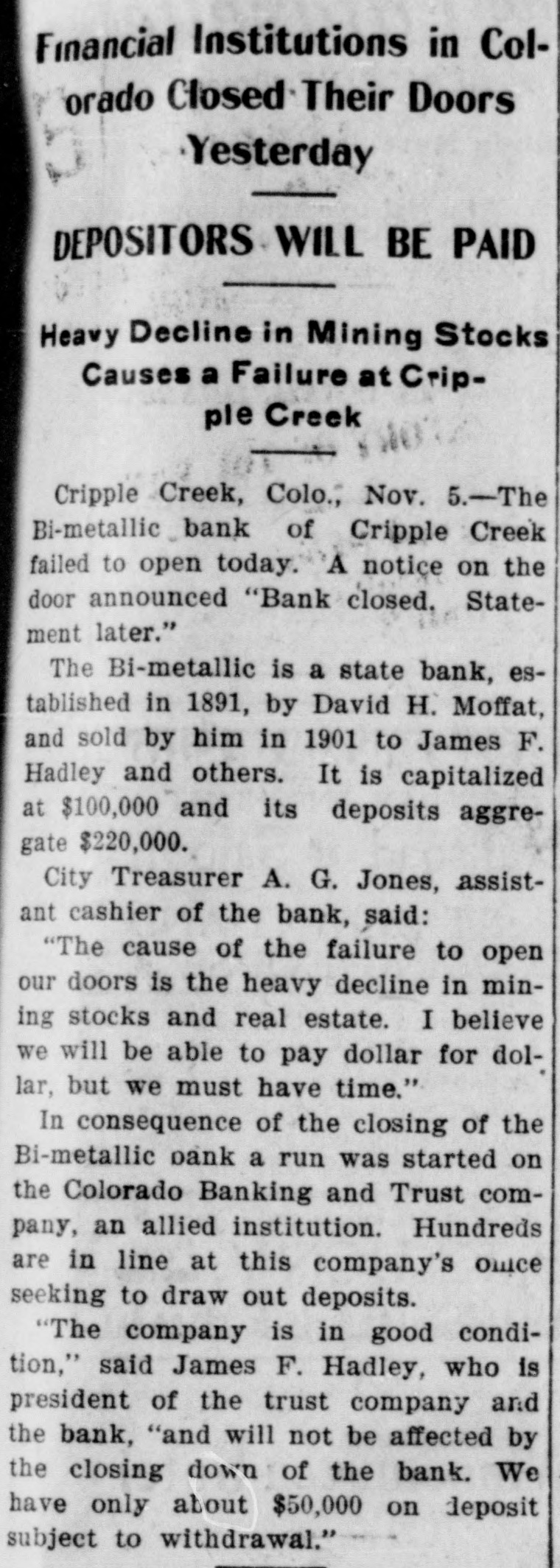 Financial Institutions in Colorado Closed Their Doors Yesterday DEPOSITORS WILL BE PAID Heavy Decline in Mining Stocks Causes a Failure at Cripple Creek Cripple Creek, Colo.; Nov. 5.-The Bi-metallic bank of Cripple Creek failed to open today. A notice on the door announced "Bank closed. Statement later." The Bi-metallic is a state bank, established in 1891, by David H. Moffat, and sold by him in 1901 to James F. Hadley and others. It is capitalized at $100,000 and its deposits aggregate $220,000. City Treasurer A. G. Jones, assistant cashier of the bank, said: "The cause of the failure to open our doors is the heavy decline in mining stocks and real estate. I believe we will be able to pay dollar for dollar, but we must have time." In consequence of the closing of the Bi-metallic bank a run was started on the Colorado Banking and Trust company, an allied institution. Hundreds are in line at this company's ouice seeking to draw out deposits. "The company is in good condition," said James F. Hadley, who is president of the trust company and the bank, "and will not be affected by the closing down of the bank. We have only about $50,000 on deposit subject to withdrawal."