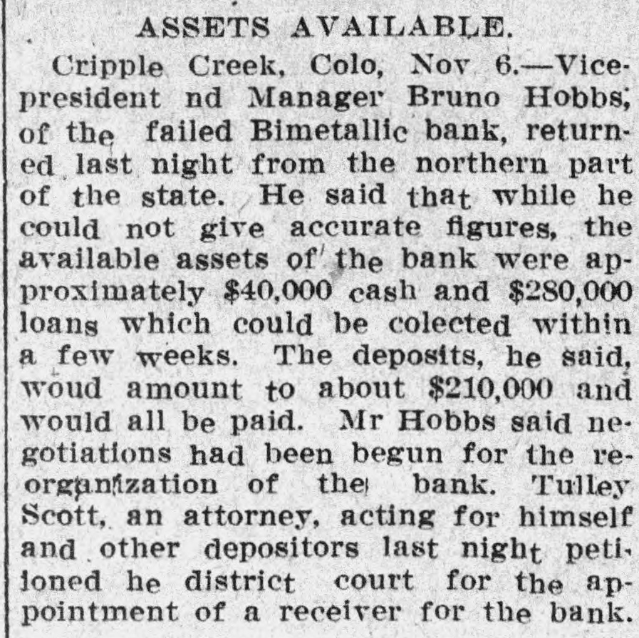 ASSETS AVAILABLE. Cripple Creek, Colo, Nov 6.-Vicepresident nd Manager Bruno Hobbs; of the failed Bimetallic bank, returned last night from the northern part of the state. He said that while he could not give accurate figures, the available assets of the bank were approximately $40,000 cash and $280,000 loans which could be colected within a few weeks. The deposits, he said, woud amount to about $210,000 and would all be paid. Mr Hobbs said negotiations had been begun for the reorganization of the bank. Tulley Scott, an attorney, acting for himself and other depositors last night petiioned he district court for the appointment of a receiver for the bank.