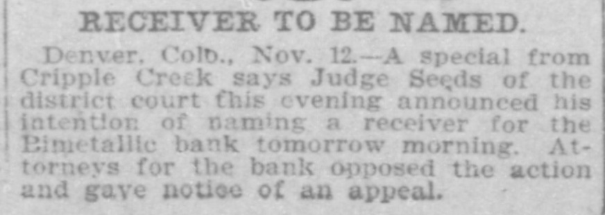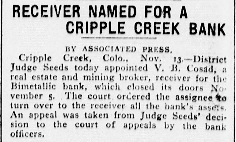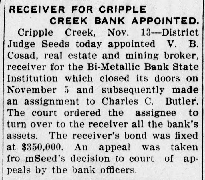 RECEIVER FOR CRIPPLE CREEK BANK APPOINTED. Cripple Creek, Nov. 13-District Judge Seeds today appointed V. B. Cosad, real estate and mining broker, receiver for the Bi-Metallic Bank State Institution which closed its doors on November 5 and subsequently made an assignment to Charles C. Butler. The court ordered the assignee to turn over to the receiver all the bank's assets. The receiver's bond was fixed at $350,000. An appeal was taken fro mSeed's decision to court of appeals by the bank officers.