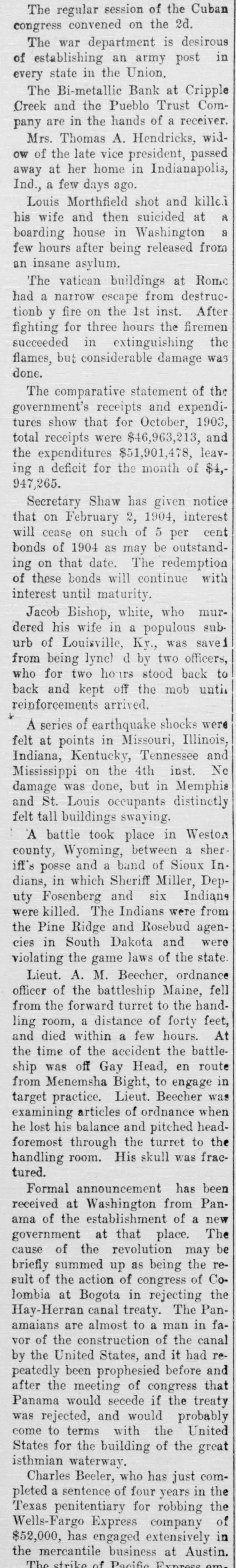 The regular session of the Cuban congress convened on the 2d. The war department is desirous in of establishing an army post every state in the Union. The Bi-metallic Bank at Cripple Creek and the Pueblo Trust Company are in the hands of a receiver. Mrs. Thomas A. Hendricks, widow of the late vice president, passed away at her home in Indianapolis, Ind., a few days ago. Louis Morthfield shot and kille.i a his wife and then suicided at a boarding house in Washington few hours after being released from an insane asylum. The vatican buildings at Rome had a narrow escape from destructionb y fire on the 1st inst. After fighting for three hours the firemen the succeeded in extinguishing flames, but considerable damage was done. The comparative statement of the government's receipts and expendithat for were total tures receipts show $46,963,213, October, 1903, leav- and the expenditures $51,901,478, ing a deficit for the month of $4, 947,265. Secretary Shaw has given notice that on February 2, 1904, interest will cease on such of 5 per cent bonds of 1904 as may be outstanding on that date. The redemption of these bonds will continue with interest until maturity. Jacob Bishop, white, who murdered his wife in a populous suburb of Louisville, Ky., was save1 from being lynch d by two officers, who for two hours stood back to back and kept off the mob until reinforcements arrived. À series of earthquake shocks were felt at points in Missouri, Illinois, Indiana, Kentucky, Tennessee and No Mississippi on the 4th inst. damage was done, but in Memphis and St. Louis occupants distinctly felt tall buildings swaying. 'A battle took place in Weston county, Wyoming, between a sher iff's and a band in which Sheriff dians, posse of Miller, Sioux Dep- Inuty Fosenberg and six Indians were killed. The Indians were from the Pine Ridge and Rosebud agencies in South Dakota and were violating the game laws of the state. Lieut. A. M. Beecher, ordnance officer of the battleship Maine, fell from the forward turret to the handling room, a distance of forty feet, At and died within a few hours. the time of the accident the battleship was off Gay Head, en route from Menemsha Bight, to engage in target practice. Lieut. Beecher was examining articles of ordnance when he lost his balance and pitched headforemost through the turret to the handling room. His skull was fractured. Formal announcement has been received at Washington from Panama of the establishment of a new at that place. The of the may government cause revolution being the re- be briefly summed up as sult of the action of congress of Colombia at Bogota in rejecting the Hay-Herran canal treaty. The Panamaians are almost to a man in favor of the construction of the canal by the United States, and it had repeatedly been prophesied before and after the meeting of congress that Panama would secede if the treaty was rejected, and would probably come to terms with the United States for the building of the great isthmian waterway. Charles Beeler, who has just completed a sentence of four years in the Texas penitentiary for robbing the Wells-Fargo Express company of $52,000, has engaged extensively in the mercantile business at Austin. The strike of Pacific Express om