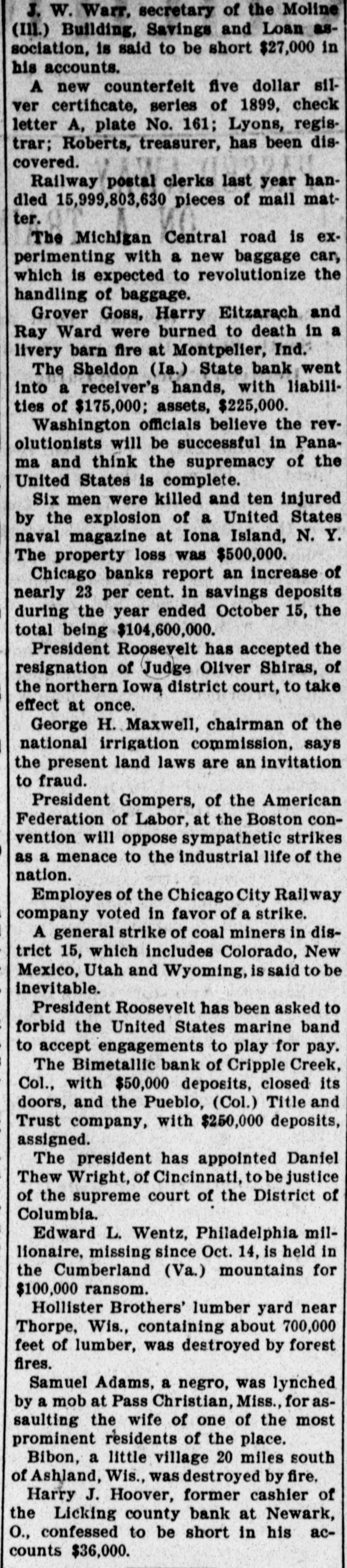 J. W. Warr, secretary of the Moline (III.) Building, Savings and Loan association, is said to be short $27,000 in his accounts. A new counterfeit five dollar silver certificate, series of 1899, check letter A, plate No. 161; Lyons, registrar; Roberts, treasurer, has been discovered. Railway postal clerks last year handled 15,999,803,630 pieces of mail matter. The Michigan Central road is experimenting with a new baggage car, which is expected to revolutionize the handling of baggage. Grover Goss, Harry Eitzarach and Ray Ward were burned to death in a livery barn fire at Montpelier, Ind. The Sheldon (Ia.) State bank went into a receiver's hands, with liabilities of $175,000; assets, $225,000. Washington officials believe the revolutionists will be successful in Panama and think the supremacy of the United States is complete. Six men were killed and ten injured by the explosion of a United States naval magazine at Iona Island, N. Y. The property loss was $500,000. Chicago banks report an increase of nearly 23 per cent. in savings deposits during the year ended October 15, the total being $104,600,000. President Roosevelt has accepted the resignation of Judge Oliver Shiras, of the northern Iową district court, to take effect at once. George H. Maxwell, chairman of the national irrigation commission, says the present land laws are an invitation to fraud. President Gompers, of the American Federation of Labor, at the Boston convention will oppose sympathetic strikes as a menace to the industrial life of the nation. Employes of the Chicago City Railway company voted in favor of a strike. A general strike of coal miners in district 15, which includes Colorado, New Mexico, Utah and Wyoming, is said to be inevitable. President Roosevelt has been asked to forbid the United States marine band to accept engagements to play for pay. The Bimetallic bank of Cripple Creek, Col., with $50,000 deposits, closed its doors, and the Pueblo, (Col.) Title and Trust company, with $250,000 deposits, assigned. The president has appointed Daniel Thew Wright, of Cincinnati, to be justice of the supreme court of the District of Columbia. Edward L. Wentz, Philadelphia millionaire, missing since Oct. 14, is held in the Cumberland (Va.) mountains for $100,000 ransom. Hollister Brothers' lumber yard near Thorpe, Wis., containing about 700,000 feet of lumber, was destroyed by forest fires. Samuel Adams, a negro, was lynched by a mob at Pass Christian, Miss., for assaulting the wife of one of the most prominent residents of the place. Bibon, a little village 20 miles south of Ashland, Wis., was destroyed by fire. Harry J. Hoover, former cashier of the Licking county bank at Newark, O., confessed to be short in his accounts $36,000.