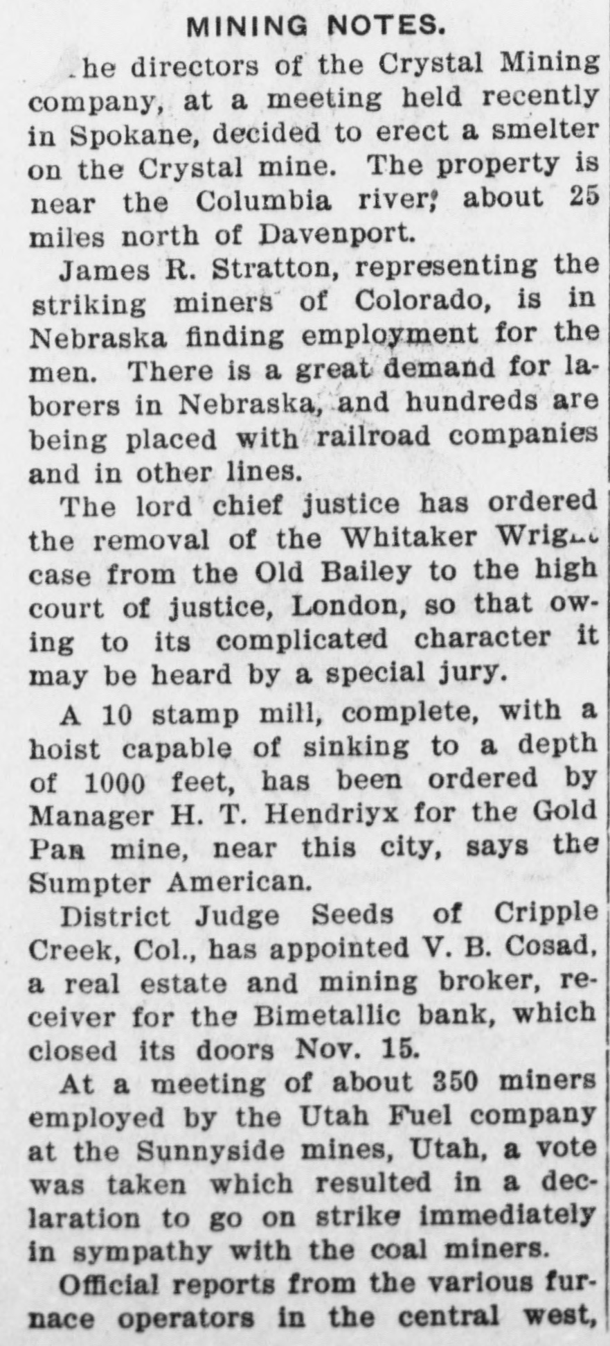 MINING NOTES. he directors of the Crystal Mining company, at a meeting held recently in Spokane, decided to erect a smelter on the Crystal mine. The property is near the Columbia river, about 25 miles north of Davenport. James R. Stratton, representing the striking miners of Colorado, is in Nebraska finding employment for the men. There is a great demand for laborers in Nebraska, and hundreds are being placed with railroad companies and in other lines. The lord chief justice has ordered the removal of the Whitaker Wright case from the Old Bailey to the high court of justice, London, so that owing to its complicated character it may be heard by a special jury. A 10 stamp mill, complete, with a hoist capable of sinking to a depth of 1000 feet, has been ordered by Manager H. T. Hendriyx for the Gold Pan mine, near this city, says the Sumpter American. District Judge Seeds of Cripple Creek, Col., has appointed V. B. Cosad, a real estate and mining broker, receiver for the Bimetallic bank, which closed its doors Nov. 15. At a meeting of about 350 miners employed by the Utah Fuel company at the Sunnyside mines, Utah, a vote was taken which resulted in a declaration to go on strike immediately in sympathy with the coal miners. Official reports from the various furnace operators in the central west,