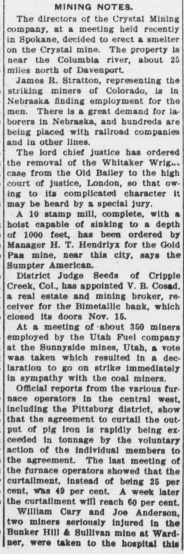 MINING NOTES. The directors of the Crystal Mining company, at a meeting held recently in Spokane, decided to erect a smelter on the Crystal mine. The property is near the Columbia river, about 25 miles north of Davenport. James R. Stratton, representing the striking miners of Colorado, is in Nebraska finding employment for the men. There is a great demand for laborers in Nebraska, and hundreds are being placed with railroad companies and in other lines. The lord chief justice has ordered the removal of the Whitaker Wright case from the Old Balley to the high court of justice, London, so that owing to its complicated character it may be heard by a special jury. A 10 stamp mill, complete, with a hoist capable of sinking to a depth of 1000 feet, has been ordered by Manager H. T. Hendriyx for the Gold Pan mine, near this city, says the Sumpter American. District Judge Seeds of Cripple Creek, Col., has appointed V. B. Cosad. a real estate and mining broker, receiver for the Bimetallic bank, which closed its doors Nov. 15. At a meeting of about 350 miners employed by the Utah Fuel company at the Sunnyside mines, Utah, a vote was taken which resulted in a declaration to go on strike immediately in sympathy with the coal miners. Official reports from the various furnace operators in the central west, including the Pittsburg district, show that the agreement to curtail the output of pig iron is rapidly being exceeded in tonnage by the voluntary action of the individual members to the agreement. The last meeting of the furnace operators showed that the curtailment, instead of being 25 per cent, was 49 per cent. A week later the curtailment will reach 60 per cent. William Cary and Joe Anderson, two miners seriously injured in the Bunker Hill & Sullivan mine at Wardner, were taken to the hospital this