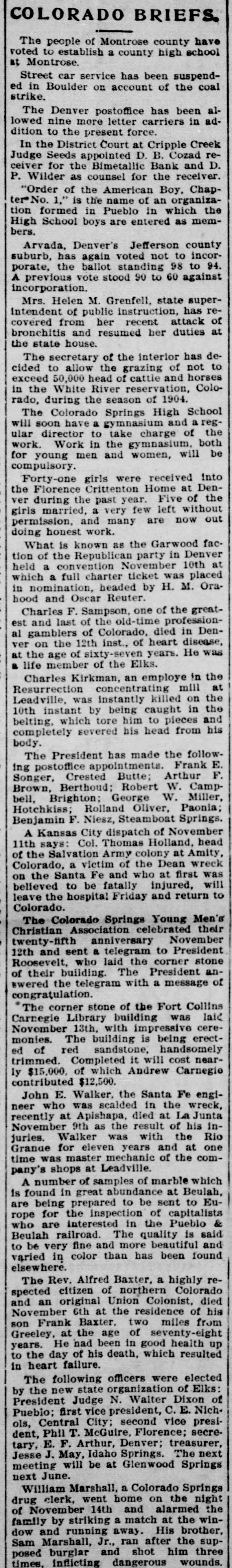 COLORADO BRIEFS. of Montrose county school have voted The to people establish a county high at Montrose. ed Street in Boulder car service on account has been of suspend- the coal alstrike. The Denver postoffice carriers has been in adlowed nine more letter force. dition to the present Creek In the District Court at D. Cripple B. Cozad reJudge Seeds the appointed Bimetallic Bank receiver. and D. P. ceiver Wilder for as counsel for the Boy, Chap"Order of the American of an organizater No. 1," is the Pueblo name in which the High tion formed School boys in are entered as memcounty bers. Denver's Jefferson not to incorArvada, has again voted 98 to 94. suburb, ballot standing 60 against A porate, previous the vote stood 90 to state superincorporation. Helen M. Grenfell, instruction. has re- of Mrs. of public attack intendent recent the state house. covered bronchitis from and her resumed her duties has de- at interior secretary of the grazing of not to The allow the and horses cided to 50,000 head of reservation, cattle ColoWhite River of 1904. in School rado, exceed the during the Springs season High The Colorado gymnasium and areg- the soon have take charge of both will director to gymnasium. be for men young ular work. Work in and the women, will into received compulsory. were Denthe Forty-one Florence the girls Crittenton past year. few Home left Five at without of the ver permission. girls during married. and work. a very many are now fac- out doing tion What of honest the is convention Republican known as November the party Garwood was in 10th Denver placed at nomination, Reuter. which held a a full charter headed ticket by H. M. Orain hood and F. Oscar Sampson, old-time one of profession- the great- DenCharles last of the died in est and of Colorado. heart disease, in ver al gamblers on the of 12th inst., Elks. of years. He was the at a life the member age of the an employe the Resurrection Charles Kirkman, concentrating instantly killed mill on in the at belting, Leadville, was being caught pieces and severed completely 10th instant which by tore him his head to from his followThe Arthur body. Presidenpointments has made the Frank E. F. ing postoffice Crested Butte; W. CampSonger, Berthoud: Robert W. Miller, Brown, bell. Brighton; Rolland George Oliver, Springs. Paonia; Hotchkiss? F. Niesz, Steamboat of November Benjamin City dispatch Holland, head 11th A Kansas says: Col. Army Thomas colony Dean at Amity, wreck of the Salvation victim of the at first was leave Colorado. the Santa a Fe fatally and who injured, return will to Colorado. on believed the to hospital be Friday and Men's Young their Colorado Sprincelebrated November twenty-nfth Christian The Association anniversary telegram corner to President stone sent a anof swered the telegram 12th Roosevelbird their and who laid The with the President a message of corner building congratulation of the Fort was Collins cere- late Carregie The Library 13th. with impressive being erectNovember building is handsomely The sandstone, cost nearCarnegio trimmed. ed monies. of red Completed of which Andrew it will englly contributed $15,000, $12,500. the Santa Fe wreck, John E. was Walker, scalded in at the La Junta neer who at Apishapa, died result of his Rio inNovember recently 9th as was the with the at one juries. Grande for eleven mechanic years and of the comtime was master at Leadville. which pany's number shops of samples abundance of marble at Beulah, to EuA found in prepared great to be of sent capitalists is are being inspection the Pueblo & rope for interested quality is and to in who are railroad. the The in beautiful found said Beulah be very color fine and than more has been rehighly varied elsewhere. Alfred Baxter. a Colorado died citizen northern The Rev. of Colonist. an at the miles November Frank Baxter, age of health Greeley, son at had the been in good which and spected original 6th Union two residence seventy-eight resulted of from his up the day in to heart failure. were years. He of his death, elected Elks: following organization officers Dixon of of by The the new Judge state N. president, Walter C.E. presi- Nich President Puebio; Central first vice McGuire. City; second Florence; vice treasurer. secredent, ols, Phil Arthur, Denver; Springs. The next tary, Jesse E. J. May, F. will Idaho be at Glenwood Springs clerk, next meeting June. Marshall. a Colorado on the Springs night the the William went home and alarmed windrug November striking 14th a match His at brother, family of by running away. after the three supposed Sam Marshall, burglar inflicting and dangerous dow and Jr., ran shot him wounds. times.