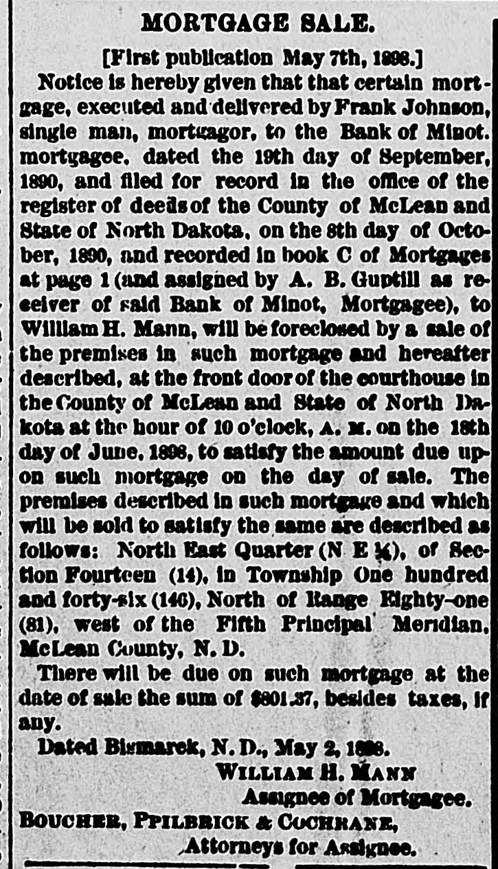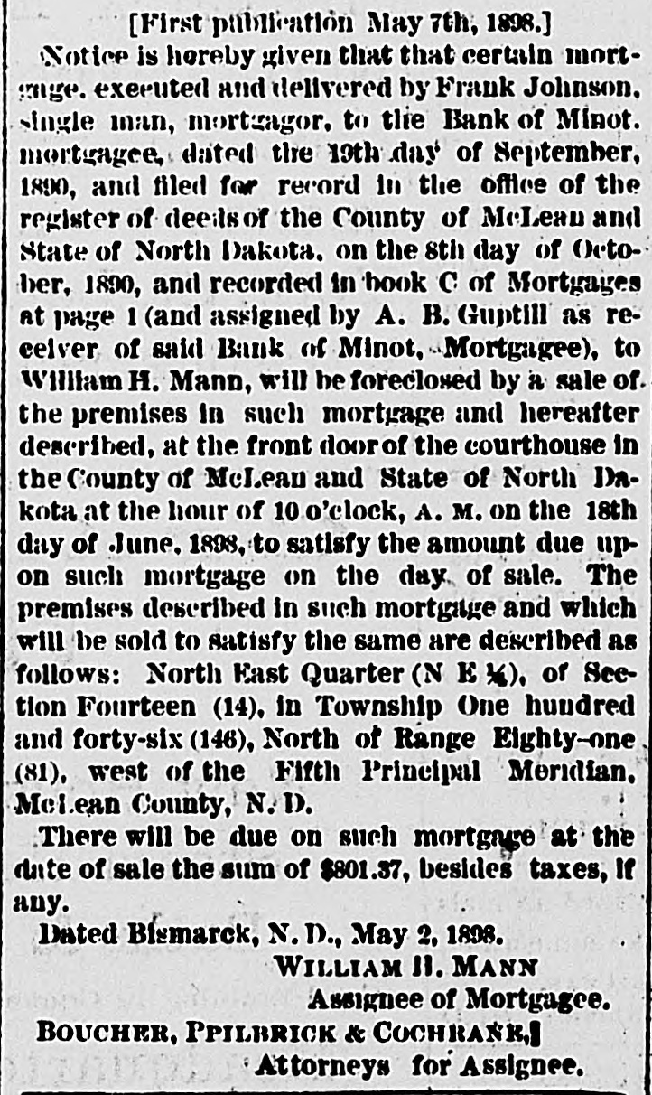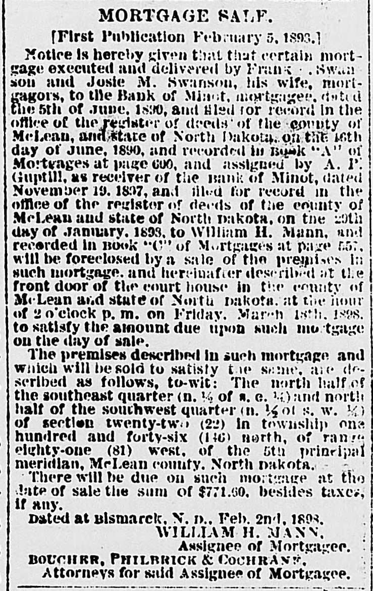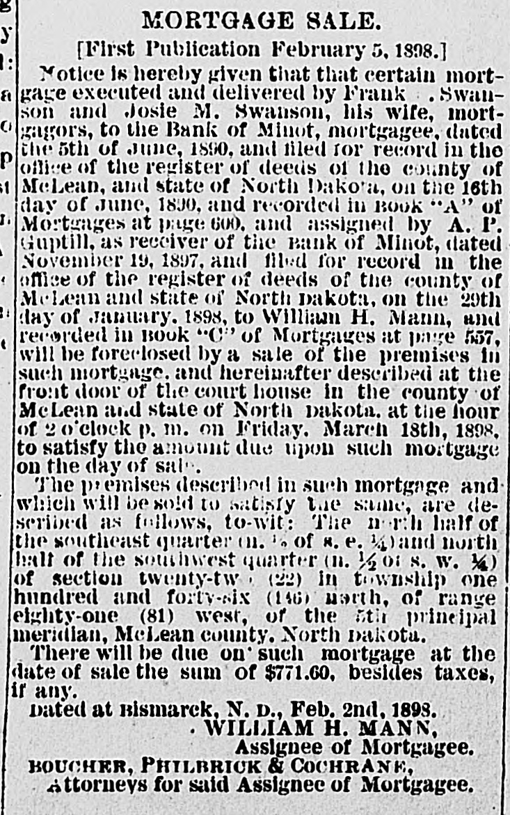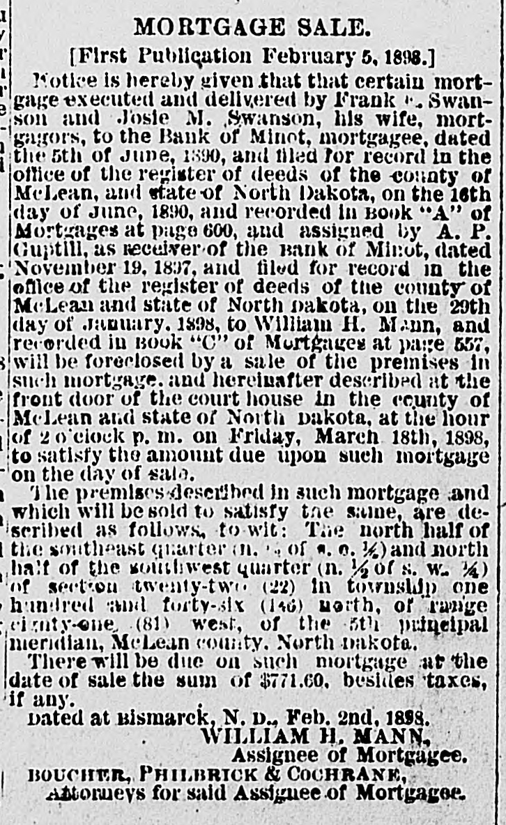 MORTGAGE SALE. [First Publication February 5. 1898.] Notice is hereby given that that certain mortgage executed and delivered by Frank Swanson and Josie M. Swanson, his wife, mortgagors, to the Bank of Minot, mortgagee, dated the 5th of June, 1890, and filed for record in the office of the register of deeds of the county of McLean, and state of North Dakora, on the 16th day of June, 1890. and recorded in BOOK 'A" of Mo: tanges at page 600. and assigned by A. P. Guptill, as receiver of the Bank of Minot, dated November 19, 1897. and filed for record in the office of the register of deeds of the county of MeLean and state of North Dakota, on the 29th day of January. 1898, to William H. Mann, and recorded in BOOK "C" of Mortgages at page 557, will be foreclosed by a sale of the premises in such mortgage. and hereinafter described at the front door of the court house in the county of McLean and state of North Dakota. at the hour of 20 clock P. m. on Friday. March 18th, 1898, to satisfy the amount due upon such mortgage on the day of sal The premises described in such mortgage and which will be sold to satisfy the same, are described as follows, to-wit: The north half of the southeast quarter (11. in of H. e. 1 land north half of the southwest quarter (11. 1/2 01 S. W. 1/2) of section twenty-tw (22) in township one hundred and forty-six (146) worth, of range eighty-one (81) west, of the 5th principal meridian, McLean county. North Dakota. There will be due on such mortgage at the date of sale the sum of $771.60, besides taxes, if any. Dated at Rismarck, N. D., Feb. 2nd, 1893. WILLIAM H. MANN, Assignee of Mortgagee. BOUCHER, PHILBRICK & COCHRANK, Attorneys for said Assignee of Mortgagee.