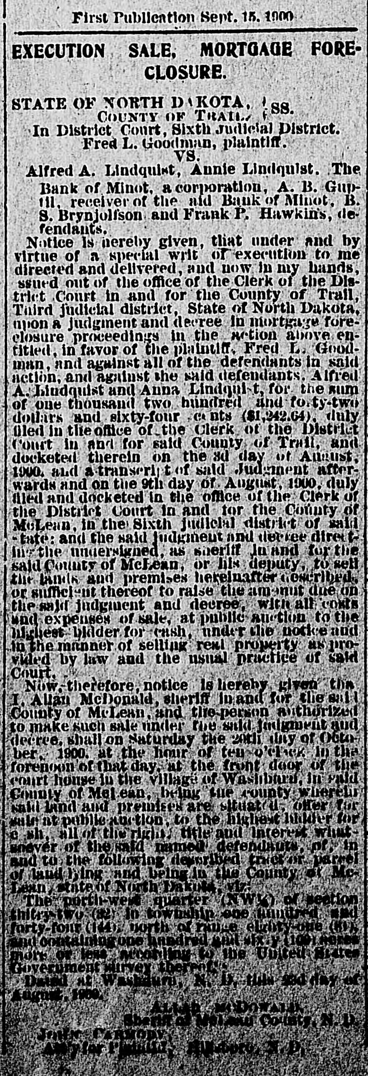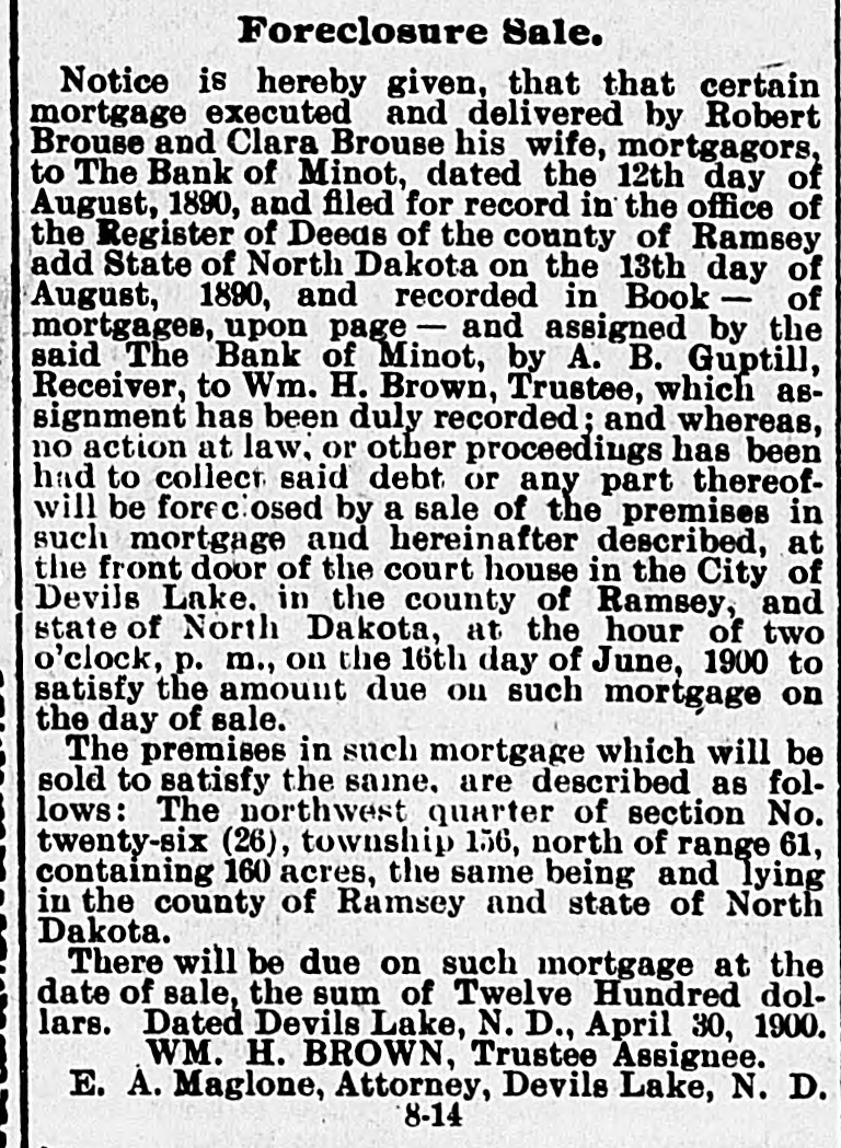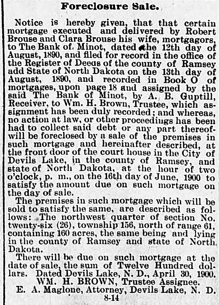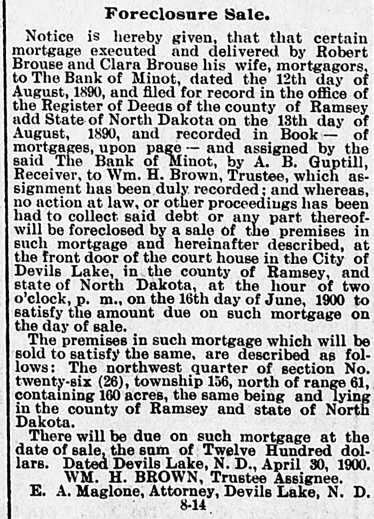 # Foreclosure Sale. Notice is hereby given, that that certain mortgage executed and delivered by Robert Brouse and Clara Brouse his wife, mortgagors, to The Bank of Minot, dated the 12th day of August, 1890, and filed for record in the office of the Register of Deeds of the county of Ramsey add State of North Dakota on the 13th day of August, 1890, and recorded in Book - of mortgages, upon page - and assigned by the said The Bank of Minot, by A. B. Guptill, Receiver, to Wm. H. Brown, Trustee, which assignment has been duly recorded; and whereas, no action at law, or other proceedings has been had to collect said debt or any part thereof will be foreclosed by a sale of the premises in such mortgage and hereinafter described, at the front door of the court house in the City of Devils Lake, in the county of Ramsey, and state of North Dakota, at the hour of two o'clock, p. m., on the 16th day of June, 1900 to satisfy the amount due on such mortgage on the day of sale. The premises in such mortgage which will be sold to satisfy the same, are described as follows: The northwest quarter of section No. twenty-six (26), township 156, north of range 61, containing 160 acres, the same being and lying in the county of Ramsey and state of North Dakota. There will be due on such mortgage at the date of sale, the sum of Twelve Hundred dollars. Dated Devils Lake, N. D., April 30, 1900. WM. H. BROWN, Trustee Assignee. E. A. Maglone, Attorney, Devils Lake, N. D. 8-14