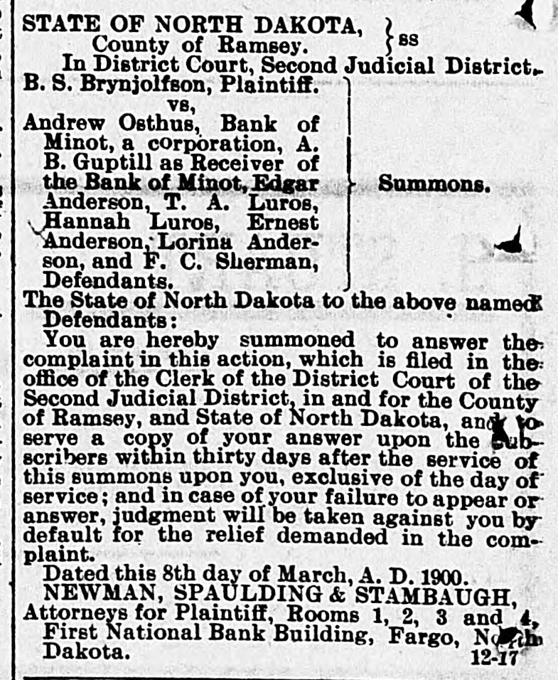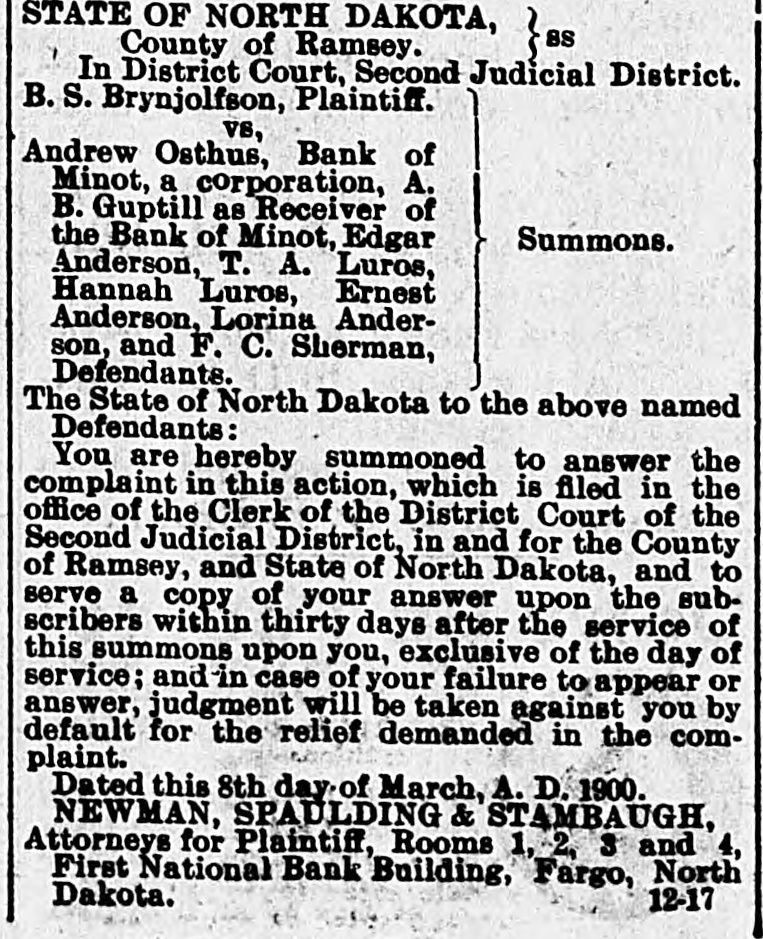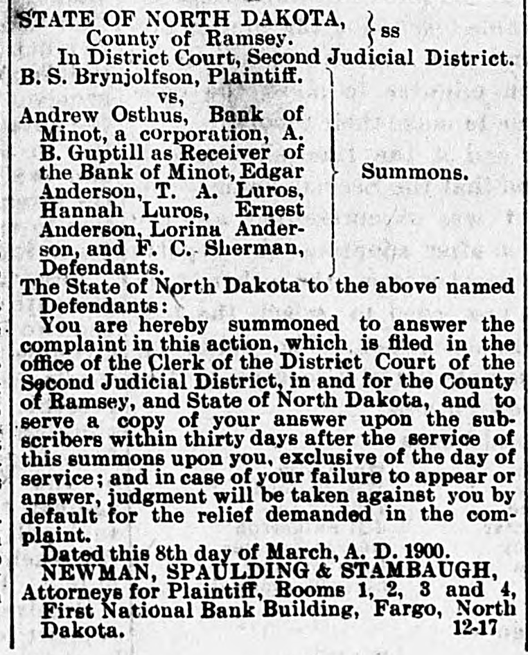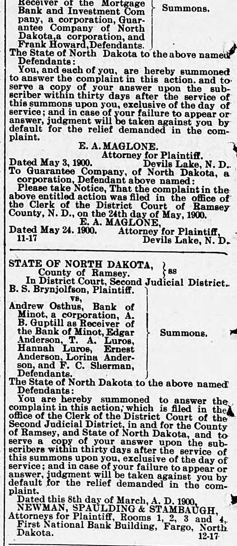 # Foreclosure Sale. Notice is hereby given, that that certain mortgage executed and delivered by Robert Brouse and Clara Brouse his wife, mortgagors, to The Bank of Minot, dated the 12th day of August, 1890, and filed for record in the office of the Register of Deeds of the county of Ramsey add State of North Dakota on the 13th day of August, 1890, and recorded in Book - of mortgages, upon page - and assigned by the said The Bank of Minot, by A. B. Guptill, Receiver, to Wm. H. Brown, Trustee, which assignment has been duly recorded; and whereas, no action at law, or other proceedings has been had to collect said debt or any part thereof will be foreclosed by a sale of the premises in such mortgage and hereinafter described, at the front door of the court house in the City of Devils Lake, in the county of Ramsey, and state of North Dakota, at the hour of two o'clock, p. m., on the 16th day of June, 1900 to satisfy the amount due on such mortgage on the day of sale. The premises in such mortgage which will be sold to satisfy the same, are described as follows: The northwest quarter of section No. twenty-six (26), township 156, north of range 61, containing 160 acres, the same being and lying in the county of Ramsey and state of North Dakota. There will be due on such mortgage at the date of sale, the sum of Twelve Hundred dollars. Dated Devils Lake, N. D., April 30, 1900. WM. H. BROWN, Trustee Assignee. E. A. Maglone, Attorney, Devils Lake, N. D. 8-14