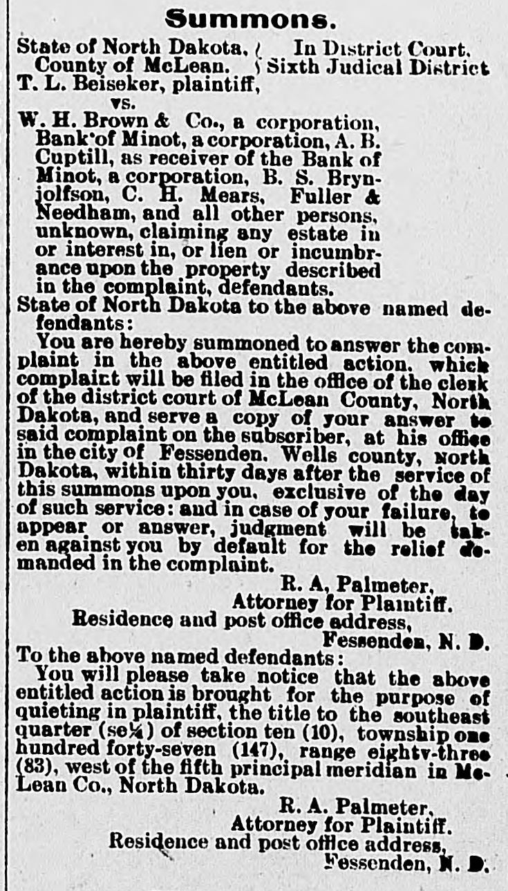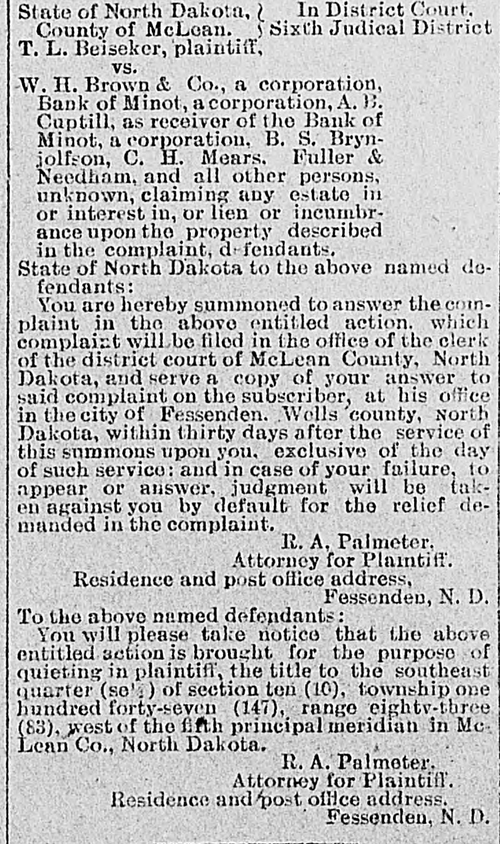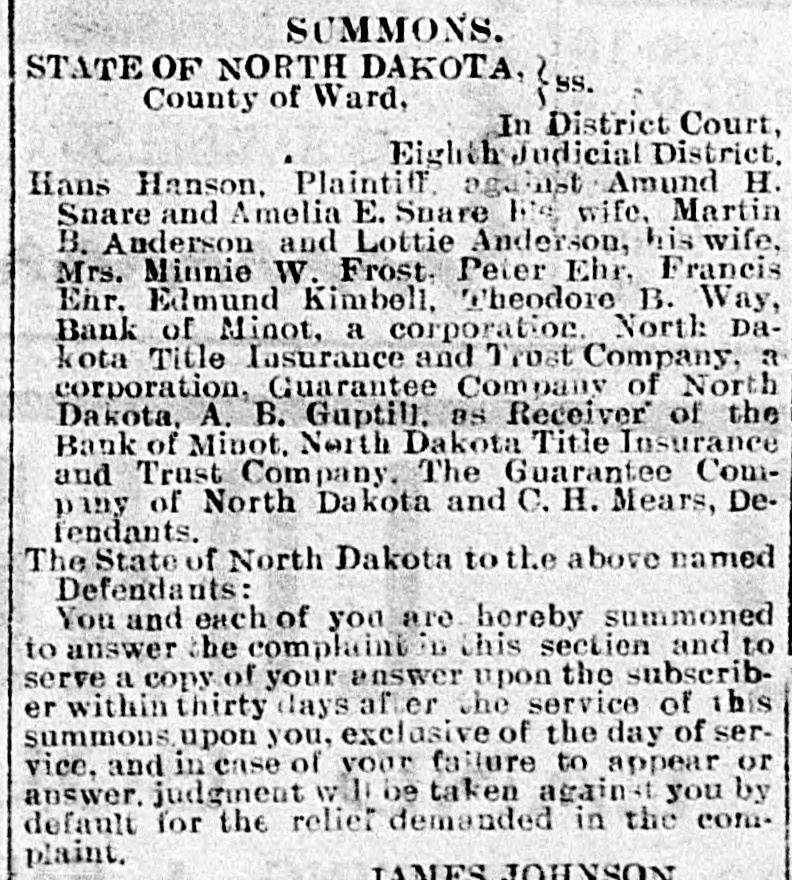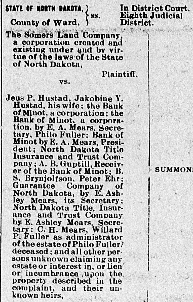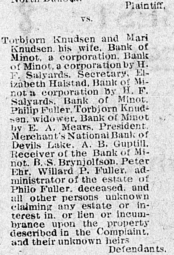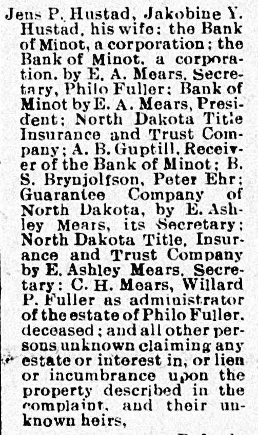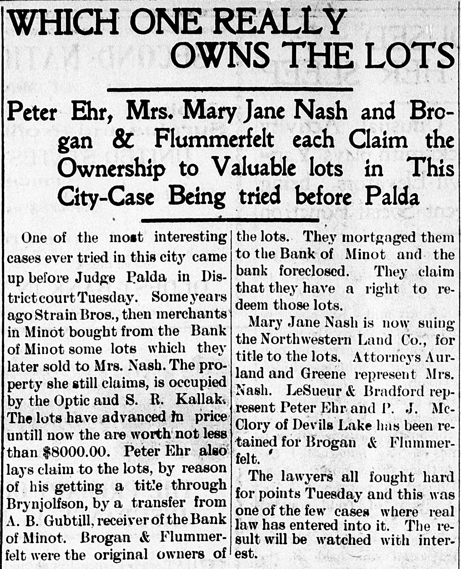 # WHICH ONE REALLY # OWNS THE LOTS Peter Ehr, Mrs. Mary Jane Nash and Brogan & Flummerfelt each Claim the Ownership to Valuable lots in This City-Case Being tried before Palda One of the most interesting cases ever tried in this city came up before Judge Palda in District court Tuesday. Some years ago Strain Bros., then merchants in Minot bought from the Bank of Minot some lots which they later sold to Mrs. Nash. The property she still claims, is occupied by the Optic and S. R. Kallak. The lots have advanced in price untill now the are worth not less than $8000.00. Peter Ehr also lays claim to the lots, by reason of his getting a title through Brynjolfson, by a transfer from A. B. Gubtill, receiver of the Bank of Minot. Brogan & Flummerfelt were the original owners of the lots. They mortgaged them to the Bank of Minot and the bank foreclosed. They claim that they have a right to redeem those lots. Mary Jane Nash is now suing the Northwestern Land Co., for title to the lots. Attorneys Aurland and Greene represent Mrs. Nash. LeSueur & Bradford represent Peter Ehr and P. J. Mc-Clory of Devils Lake has been retained for Brogan & Flummerfelt. The lawyers all fought hard for points Tuesday and this was one of the few cases where real law has entered into it. The result will be watched with interest.
