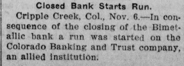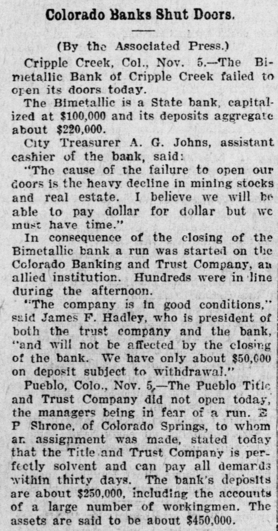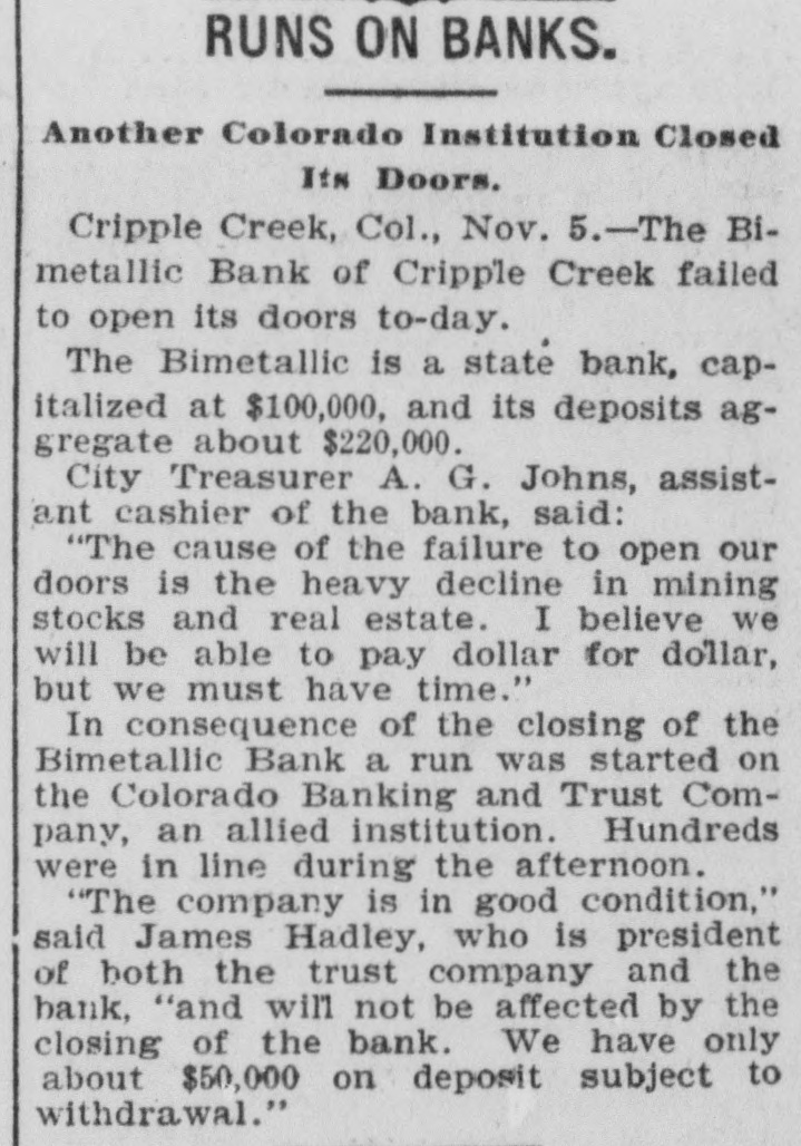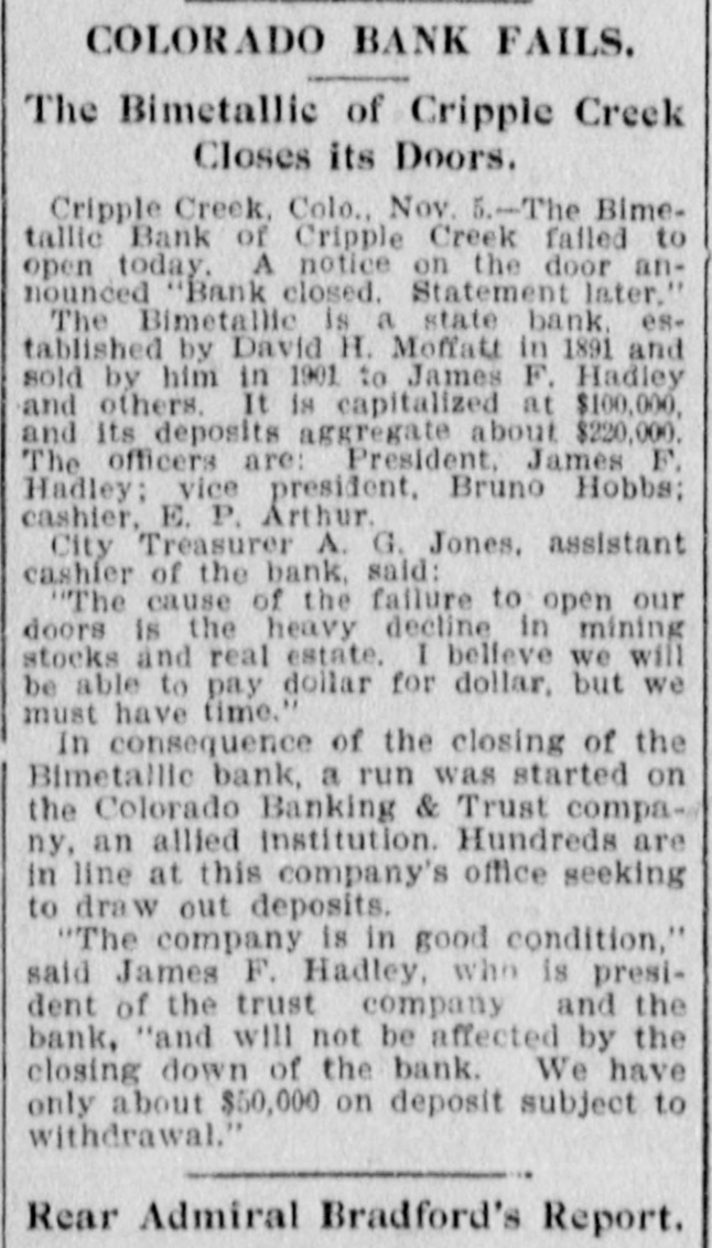 WASHINGTON, Nov. 5.-The First National bank of Victor, Colorado has been closed by order of the acting comptroller of the currency, the examiner reporting the bank to be insolvent. James B. Lazear, national bank examiner, has been appointed receiver. The bank was organized in September, 1900, The failure, the act ing comptroller states, was due to losses sustained by reason of excessive accommodations extended to mining interests with which officers of the bank were connected. The statement of the bank September 9th last, showed deposits of over $300,000. Will Be Paid in Full. VICTOR, Colo., Nov. 5.-Frank M. Woods, general manager of the Woods Investment company, which is president of the First National bank which failed, said: "The Woods Investment company is behind the bank and depositors will be paid in full. The strike resulted in withdrawals from the bank chiefly by men leaving the district, and our reserve was depleted." CRIPPLE CREEK, Colo., Nov. 5.The Bimetallic Bank of Cripple Creek failed to open today. A notice on the door announced: "Bank closed; statement later." CRIPPLE CREEK, Colo., Nov. 5.The Bimetallic State bank was established in 1891 by D. H. Moffatt and sold by him in 1901 to Jas. F. Hadley. It is capitalized at $100,000 and the deposits aggregate $220,000. The officers are: President, Jas. F. Hadley; vice-president, Bruno Hobbs; cashier, E. P. Arthur. City Treasurer A. G. Jones, assistant cashier of the bank said this morning: "The cause of the failure to open our doors is the heavy decline in mining stocks and real estate. I believe we will be able to pay dollar for dollar, but we must have time." The news of the close of the Bimetallic bank spread rapidly and a run began on the Colorado Banking and Trust company, of which James F. Hadley is also president. Hundreria are in line.