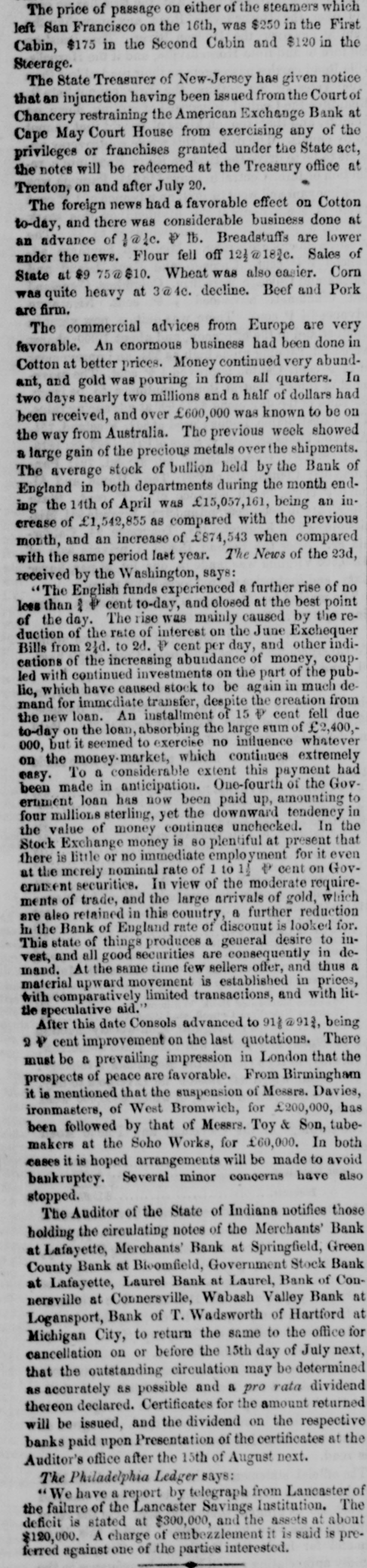 The receipts the office or the Assistant Treasurer of this port to-day, were $244,085 86; paid, $155,480 17; be. Jance, $3,317,473 41. The committee appointed by the Board of Brokers have reported that the first issue of bonds by the New York Dentral Railroad Company given for the premium on the stock of companies forming the constitution, shall hereafter be known as the New York Central Railroad bonds The issue given for subscription to the stock of the Lake Shore and Great Western Railroad companies shall hereafter be known as New York Central Railroad subscription bonds. The bonds are all of the same date, and mature in 1880. The Albany Atlas of last evening says :The Board of Directors of the New York Central Railroad Company will meet here on Friday next to declare their dividend from the carnit gs of the road from the 1st of May to the 1st of February, last. The earnings of the road will amount to & net sum sufficient to declare six per cent, and leave a handsome sum after paying interast OD the debt, and laying aside the sinking fund of 1) per cent. What the dividend will be is of course unknown, though it will certainly not be less than four per cent, which will probably be the measure of the semi annual divi dends. It will be paid in cash on the 1st of February proximo. The report of the New Jersey bank commissioners to the Legislature furnishes the following information reistive to the banks under the general laws of the State:The City Bank at Cape Island has closed its busineas, and the Bank of Cape May Company has been started ia its place. Its stock in generally owned in the county, and it is doing a bona fide business. A new bank called the Mechanics' and Traders' Bank has been established in Jersey City since the last report, which is also bona fide, and apparently sound and healthy The Hudson County Back, Newark City Bank, Borden town Banking Company, and Central Bank, at Hightown conduct & legitimate business. and deserve the confidence of the community. The Hudson Company, the Borden town Banking Company, and the Central, have applied for an obtained an increased amount of stock. &The Ocean Bank at Bergen Iron Works, the Delaware and Hudson at Tom's river, the Merchants' Bank at May's landing, the Atlantic at Cape May Court House. the Far. mers' at Freehold, and the Tradesmen's at Flemington, are in process of liquidation. Legal proceedings have been commenced since the last report against the American Exchange Bank, Cape May Court House, the Bank of America do, and the Traders do. The American Exchange Bank has been closed by law. The proceedings against the other banks have been suspended, they having complied with the law. The case of the Merchants' Bank at Bridgeton is still before the Chancellor The Commissioners cannot say as to the character of the Public Stock Bank, Belvidere, the Passaic County Bank at Paterson, the Wheat Growers' at Newton, the Bank of North America at Flemington, and the America Bank Treaton; but no legal complaint has been made concerning them. The Commissioners recommend the enastment of a supplement to the general law, with the following fea tures 1. No bank to have notes from the Treasurer till a certificate is given that their capital stock is paid in, in spesie. 2. No bank to organize till $30,000 is placed with the State Treasurer. 8. No bank to receive notes till the Bank Commission are certify to their possessing a Lona fide banking house. 4 Three directors to be residents of the place where the bank is located. 5. Annual statements hereafter to be made to the Bank Commissioners. 6. Stockholders to file certificates that they are bona fide owners of the stock registered in their names 7. The Commissioners' approval of the location of B bank to be necessary to its going into operation. The eighth annual report of the Macon and Western ,Railroad Company gives the following statement of receipts and disbursements for the year 1853 :MACON AND WESTERN (GEO.) RAILROAD.