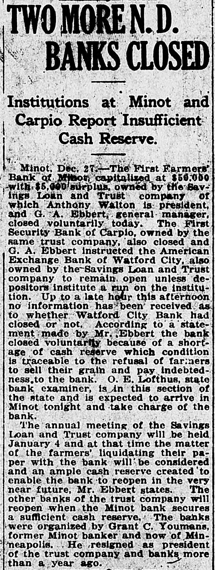 TWO MOREN.D. BANKS CLOSED Institutions at Minot and Carpio Report Insufficient Cash Reserve. Minot. Dec. 27.-The First Farmers Bank of Minot. capitalized at $50.000 with $5,000 surplus. owned by the Savings Loan and Trust company of which Anthony Walton is president, and G. A. Ebbert, general manager, closed voluntarily today. The First Security Bank of Carpio, owned by the same trust company, also closed and G. A. Ebbert instructed the American Exchange Bank of Watford City, also owned by the-Savings Loan and Trust company to remain. open unless depositors institute a run on the institution. Up to a late hour this afternoon no information has been received as to whether Watford City Bank had closed or not. According to a statement made by Mr. Ebbert the bank closed voluntarity because of a shortage of cash reserve which condition is traceable to the refusal of farmers to sell their grain and pay indebtedness. to the bank. O. E. Lofthus, state bank examiner, is in this section of the state and is expected to arrive in Minot tonight and take charge of the bank. The annual meeting of the Savings Loan and Trust company will be held January 4 and at that time the matter of the farmers' liquidating their paper with the bank will be considered and an ample cash reserve created to enable the bank to reopen in the very near future, Mr. Ebbert states. The other banks of the trust company will reopen when the Minot bank secures a sufficient cash reserve. The banks were organized by Grant C. Youmans, former Minot banker and now of Minneapolis. He resigned as president of the trust company and banks more than a year ago.