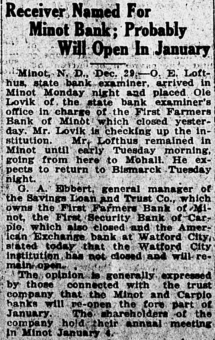 Receiver Named For Minot Bank; Probably Will Open In January Minot, N. D., Dec. 29.-O. E. Lofthus, state bank examiner, arrived in Minot Monday night and placed Ole Lovik of the state bank examiner's office in charge of the First Farmers Bank of Minòt which closed yesterday. Mr. Lovik is checking up the institution. Mr. Lofthus remained in Minot until early Tuesday morning, going from here to Mohall. He expects to return to Bismarck Tuesday night. G. A. Ebbert, general manager of the Savings Loan and Trust Co., which owns the First Farmers Bank of Minot, the First Security Bank of-Carpio, which also closed and the American Exchange bank at Watford City, stated today that the Watford City institution has not closed and will remain open. The opinion is generally expressed by those connected with the trust company that the Minot and Carpio banks will re-open the fore part of January. The shareholders of the company hold their annual meeting in Minot January 4.