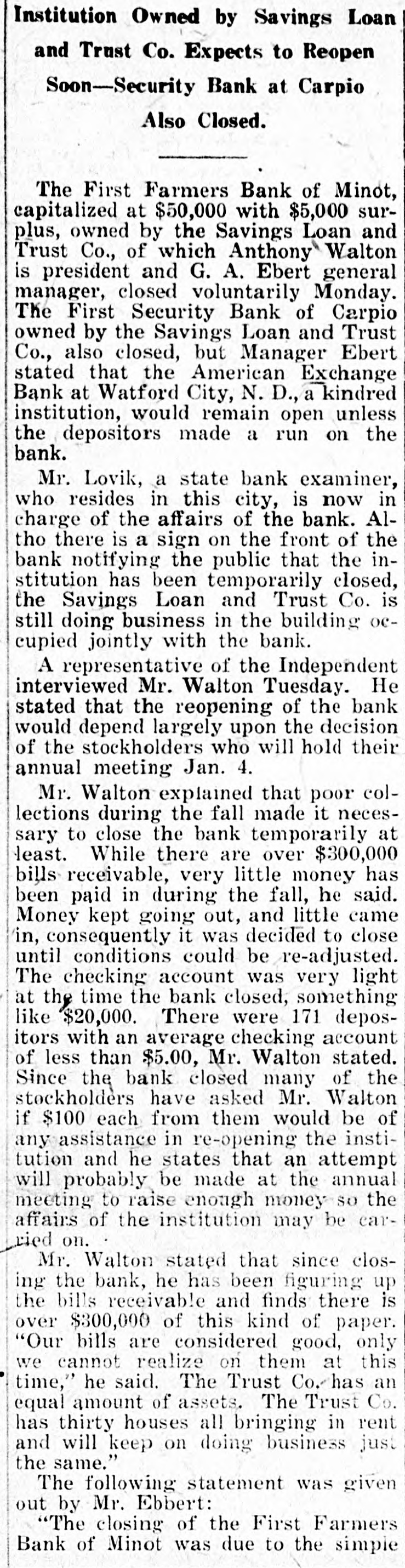 Institution Owned by Savings Loan and Trust Co. Expects to Reopen Soon-Security Bank at Carpio Also Closed. The First Farmers Bank of Minot, capitalized at $50,000 with $5,000 surplus, owned by the Savings Loan and Trust Co., of which Anthony Walton is president and G. A. Ebert general manager, closed voluntarily Monday. The First Security Bank of Carpio owned by the Savings Loan and Trust Co., also closed, but Manager Ebert stated that the American Exchange Bank at Watford City, N. D., a kindred institution, would remain open unless the depositors made a run on the bank. Mr. Lovik, a state bank examiner, who resides in this city, is now in charge of the affairs of the bank. Altho there is a sign on the front of the bank notifying the public that the institution has been temporarily closed, the Savings Loan and Trust Co. is still doing business in the building occupied jointly with the bank. A representative of the Independent interviewed Mr. Walton Tuesday. He stated that the reopening of the bank would depend largely upon the decision of the stockholders who will hold their annual meeting Jan. 4. Mr. Walton explained that poor collections during the fall made it necessary to close the bank temporarily at least. While there are over $300,000 bills receivable, very little money has been paid in during the fall, he said. Money kept going out, and little came in, consequently it was decided to close until conditions could be re-adjusted. The checking account was very light at the time the bank closed, something like $20,000. There were 171 depositors with an average checking account of less than $5.00, Mr. Walton stated. Since the bank closed many of the stockholders have asked Mr. Walton if $100 each from them would be of any assistance in re-opening the institution and he states that an attempt will probably be made at the annual meeting to raise enough money so the affairs of the institution may be carried on. Mr. Walton stated that since closing the bank, he has been figuring up the bills receivable and finds there is over $300,000 of this kind of paper. "Our bills are considered good, only we cannot realize on them at this time," he said. The Trust Co. has an equal amount of assets. The Trust Co. has thirty houses all bringing in rent and will keep on doing business just the same." The following statement was given out by Mr. Ebbert: "The closing of the First Farmers Bank of Minot was due to the simple