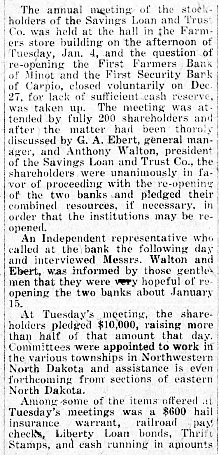 The annual meeting of the stockholders of the Savings Loan and Trust Co. was held at the hall in the Farmers store building on the afternoon of Tuesday, Jan. 4, and the question of re-opening the First Farmers Bank of Minot and the First Security Bank of Carpio, closed voluntarily on Dec. 27, for lack of sufficient cash reserve, was taken up. The meeting was at tended by fully 200 shareholders and after the matter had been thoroly discussed by G. A. Ebert, general manager, and Anthony Walton, president of the Savings Loan and Trust Co., the shareholders were unanimously in favor of proceeding with the re-opening of the two banks and pledged their combined resources, if necessary, in order that the institutions may be reopened. An Independent representative who called at the bank the following day and interviewed Messrs. Walton and Ebert, was informed by those gentle> men that they were very hopeful of reopening the two banks about January 15. At Tuesday's meeting, the shareholders pledged $10,000, raising more than half of that amount that day. Committees were appointed to work in the various townships in Northwestern North Dakota and assistance is even forthcoming from sections of eastern North Dakota. Among some of the items offered Tuesday's meetings was a $600 hail insurance warrant, railroad pay checks, Liberty Loan bonds, Thrift Stamps, and cash running in amounts