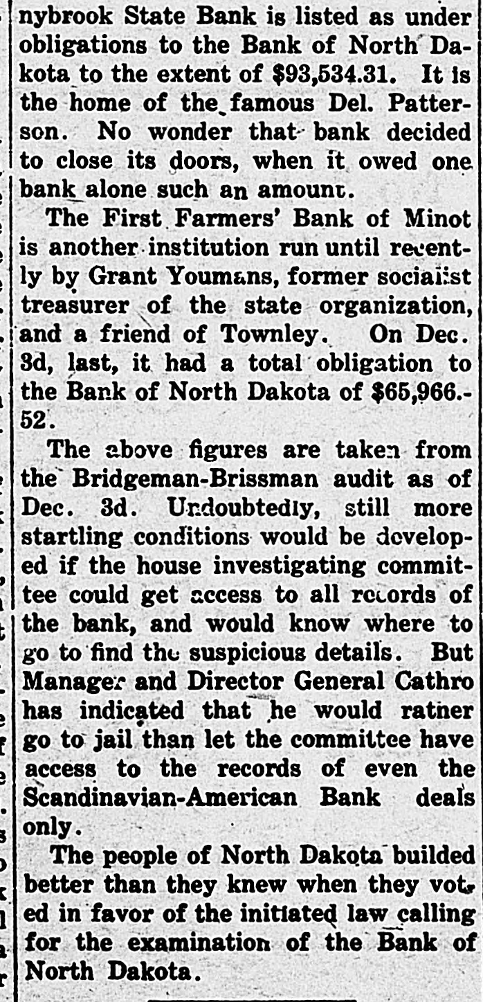 nybrook State Bank is listed as under obligations to the Bank of North Dakota to the extent of $93,534.31. It is the home of the famous Del. Patterson. No wonder that bank decided to close its doors, when it owed one bank alone such an amount. The First Farmers' Bank of Minot is another institution run until recently by Grant Youmans, former socialist treasurer of the state organization, and a friend of Townley. On Dec. 3d, last, it had a total obligation to the Bank of North Dakota of $65,966.52. The above figures are taken from the Bridgeman-Brissman audit as of Dec. 3d. Undoubtedly, still more startling conditions would be developed if the house investigating committee could get access to all records of the bank, and would know where to go to find the suspicious details. But Manager and Director General Cathro has indicated that he would ratner go to jail than let the committee have access to the records of even the Scandinavian-American Bank deals only. The people of North Dakota builded better than they knew when they vot ed in favor of the initiated law calling for the examination of the Bank of North Dakota.