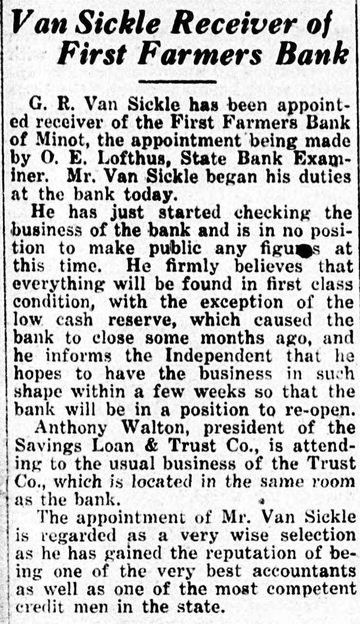 Van Sickle Receiver of First Farmers Bank G. R. Van Sickle has been appointed receiver of the First Farmers Bank of Minot, the appointment being made by O. E. Lofthus, State Bank Examiner. Mr. Van Sickle began his duties at the bank today. He has just started checking the business of the bank and is in no position to make public any figures at this time. He firmly believes that everything will be found in first class condition, with the exception of the low cash reserve, which caused the bank to close some months ago, and he informs the Independent that he hopes to have the business in such shape within a few weeks so that the bank will be in a position to re-open. Anthony Walton, president of the Savings Loan & Trust Co., is attending to the usual business of the Trust Co., which is located in the same room as the bank. The appointment of Mr. Van Sickle is regarded as a very wise selection as he has gained the reputation of being one of the very best accountants as well as one of the most competent credit men in the state.