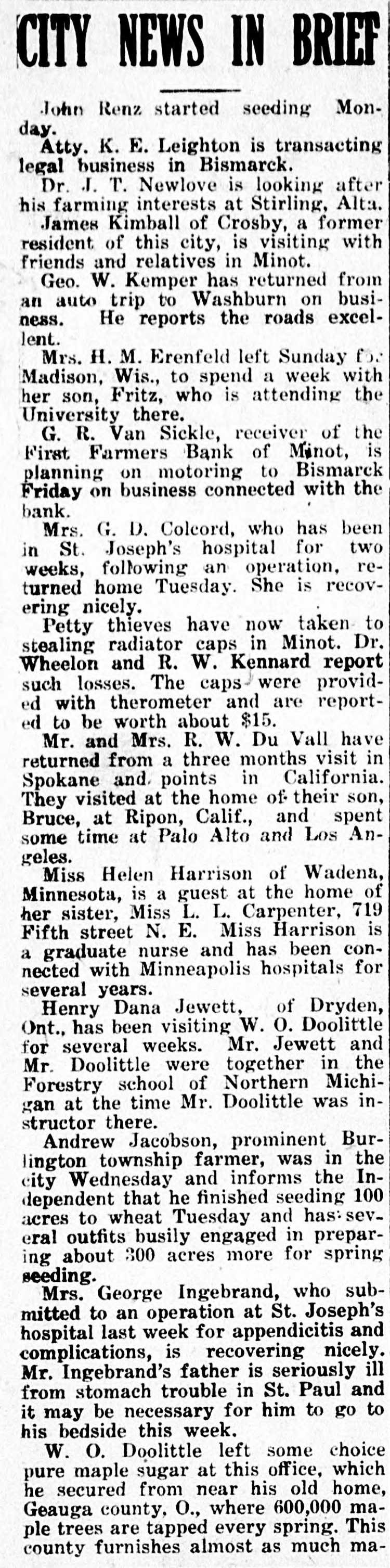 CITY NEWS IN BRIEF John Renz started seeding Monday. Atty. K. E. Leighton is transacting legal business in Bismarck. Dr. J. T. Newlove is looking after his farming interests at Stirling, Alta. James Kimball of Crosby, a former resident of this city, is visiting with friends and relatives in Minot. Geo. W. Kemper has returned from an auto trip to Washburn on business. He reports the roads excellent. Mrs. H. M. Erenfeld left Sunday for Madison, Wis., to spend a week with her son, Fritz, who is attending the University there. G. R. Van Sickle, receiver of the First Farmers Bank of Minot, is planning on motoring to Bismarck Friday on business connected with the bank. Mrs. G. D. Colcord, who has been in St. Joseph's hospital for two weeks, following an operation, returned home Tuesday. She is recovering nicely. Petty thieves have now taken to stealing radiator caps in Minot. Dr. Wheelon and R. W. Kennard report such losses. The caps were provided with therometer and are reported to be worth about $15. R. W. Du Vall have a three returned Mr. and from Mrs. months visit in Spokane and. points in California. They visited at the home of- their son, Bruce, at Ripon, Calif., and spent some time at Palo Alto and Los Angeles. Miss Helen Harrison of Wadena, Minnesota, is a guest at the home of her sister, Miss L. L. Carpenter, 719 N. E. Miss nurse a Fifth graduate street and has Harrison been con- is nected with Minneapolis hospitals for several years. Henry Dana Jewett, of Dryden, Ont., has been visiting W. O. Doolittle for several weeks. Mr. Jewett and Mr. Doolittle were together in the Forestry school of Northern Michigan at the time Mr. Doolittle was instructor there. Andrew Jacobson, prominent Burlington township farmer, was in the and that he city dependent Wednesday finished informs seeding the 100 Inacres to wheat Tuesday and has:several outfits busily engaged in preparing about 300 acres more for spring seeding. Mrs. George Ingebrand, who subto an at last week for mitted hospital operation appendicitis St. Joseph's and complications, is recovering nicely. Mr. Ingebrand's father is seriously ill from stomach trouble in St. Paul and it may be necessary for him to go to his bedside this week. W. O. Doolittle left some choice pure maple sugar at this office, which he secured from near his old home, Geauga county, O., where 600,000 maple trees are tapped every spring. This county furnishes almost as much ma-